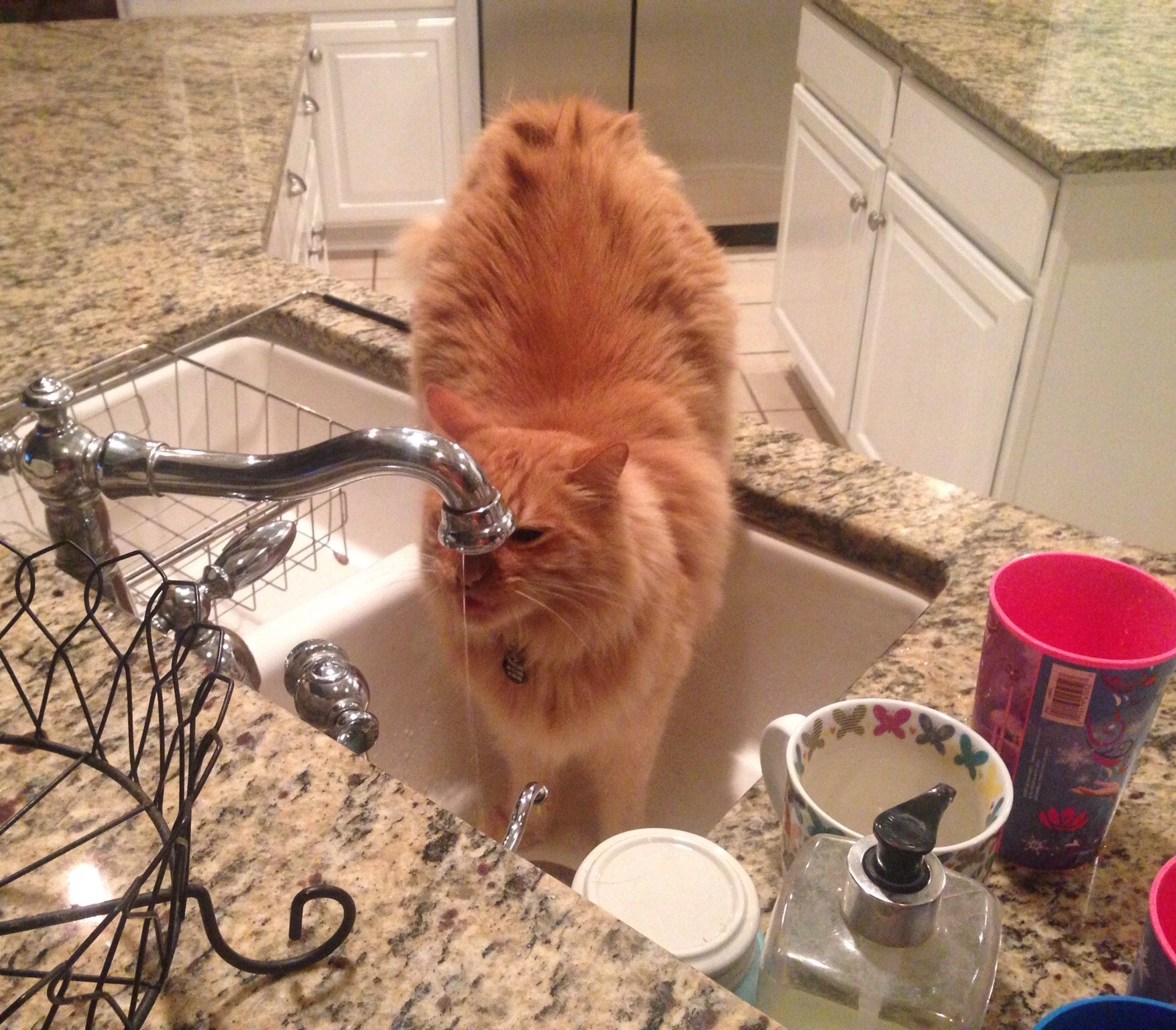 The very blue-eyed Velvet blending in with the carpetAnderson drinking from the faucetLeona chillinRafa and Derek at play
