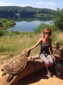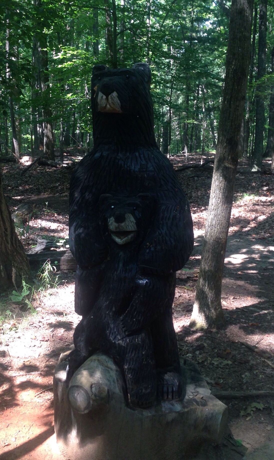 The Ragged Mountain LakeThe lake and damThe first “sight” along the trail — the mountain man and BobAnother view of the lakeThe only time I want to be this close to a black bear and her cub!Apparently, I’m partial to lake viewsThe next “sight” a bird with a fishPart of the forest trailBonding with the turtlesA water tower in the park
