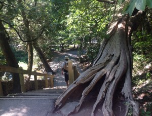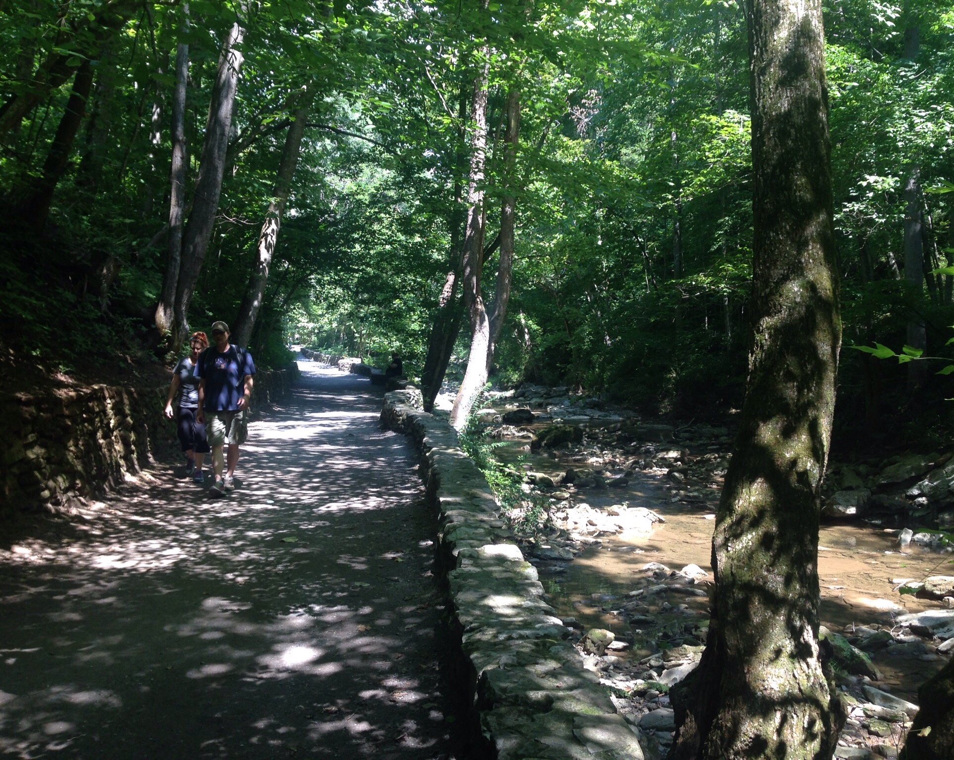 The very large, and stately Visitor Center from which you start the walkThis is the official entrance to the trail that you see as you exit the Visitor CenterStill on our way to the start of the trail, I was amazed at the growth of this treeThe 215 foot tall natural bridge on land once owned by Thomas Jefferson and surveyed by George WashingtonGeorge Washington may never have told a lie but he wasn’t above a little “graffiti.” In the white box are his initials that he apparently carved in the bridge while he was surveying the land.The very nice walking trail along Cedar Creek which is what created the natural bridge structureA recreation of a Monacan Indian family living hutThe cave on the property that was once used for mining saltpeter for gunpowderLace Falls at the end of the 1 mile trail. It’s an out and back, so you just turn around here and walk back the same way.