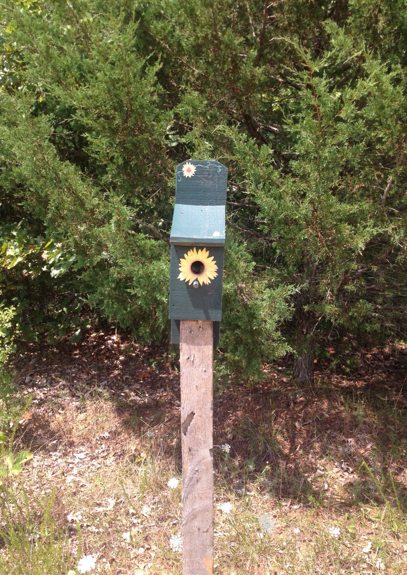 A picnic area at the start of the loop trailOne of the many bird houses along the trailThe initial part of the trail was in meadow before heading into woodsView 1 from the highest point of the hikeView 2