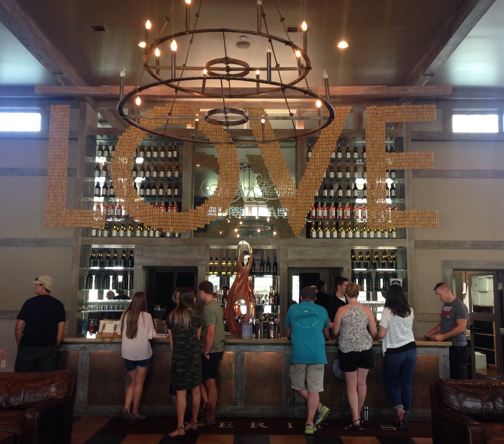The Wild Wolf “Brewery” which is actually a restaurant, bar, gift shop, play yard, and event center. We just walked around and gawked here.A putt putt course and the event center at the breweryThe lovely and yummy Veritas Vineyards and WineryThe inside of the tasting room — the love sign is made from corkA view of the yard and vines