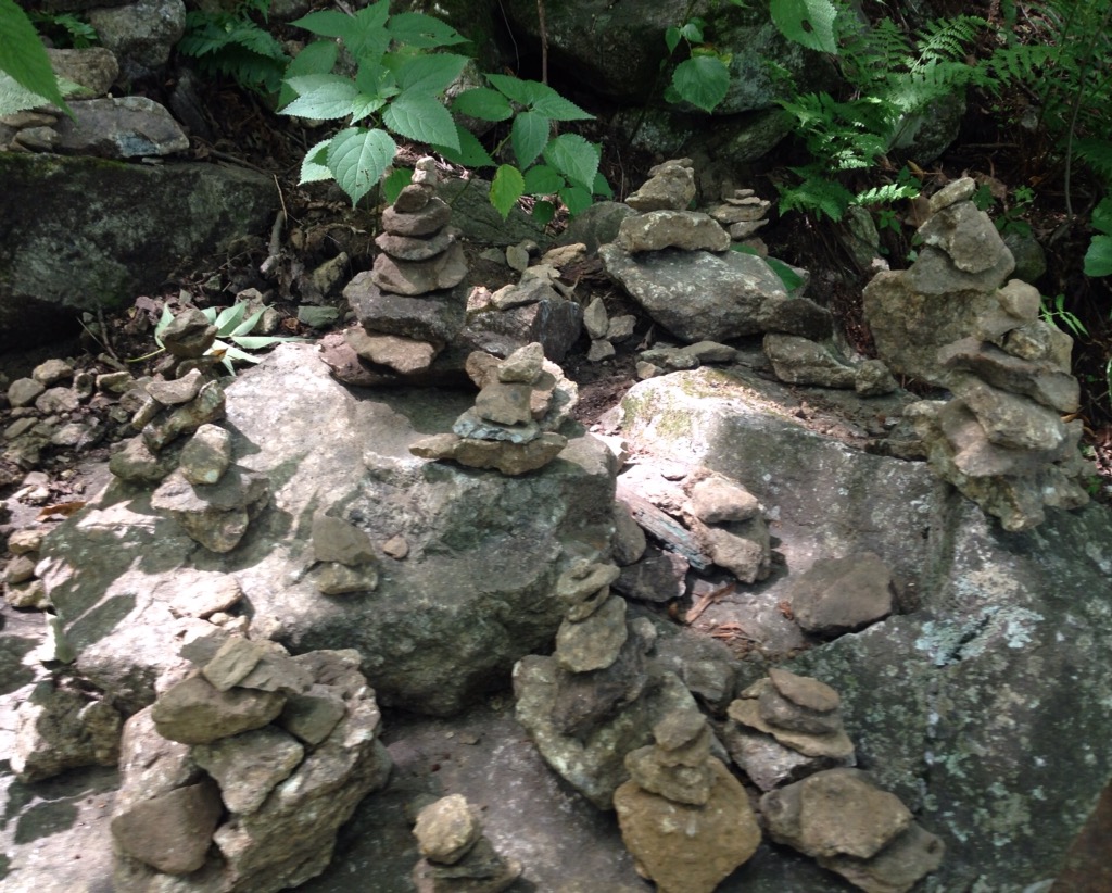 The best view of the falls (which never seemed terribly tall)The well-marked trailA higher view of the fallsSome of the big rocks we saw along the wayA view of the surrounding National ForestAn opening in a rockA clan of cairns