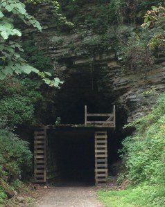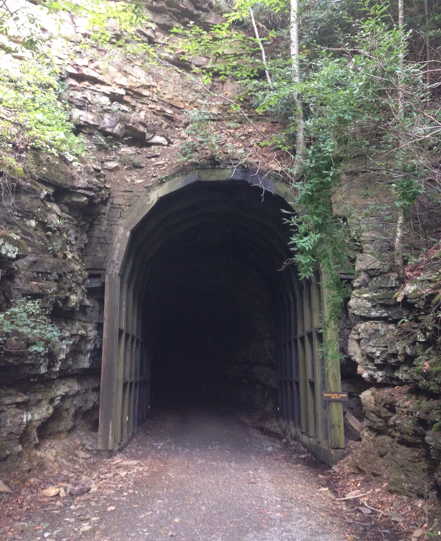 A mile marker along the route and a glimpse of the Greenbrier RiverA beautiful house on an island in the RiverWe walked through a 430 foot long tunnel along the route.The other entrance to the tunnelA better view of the Greenbrier River and the Monongahela National Forest