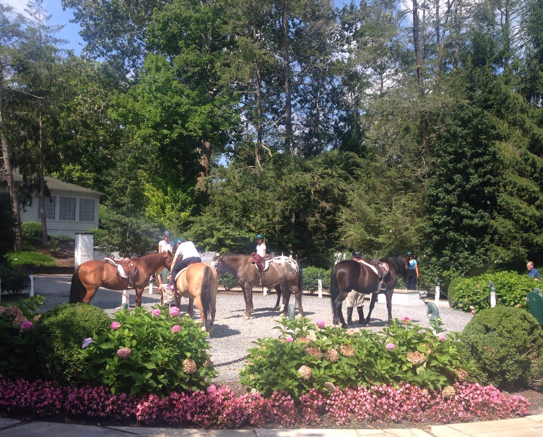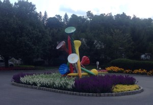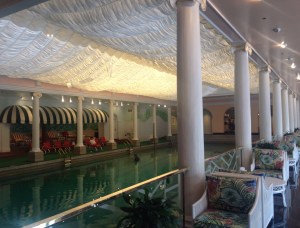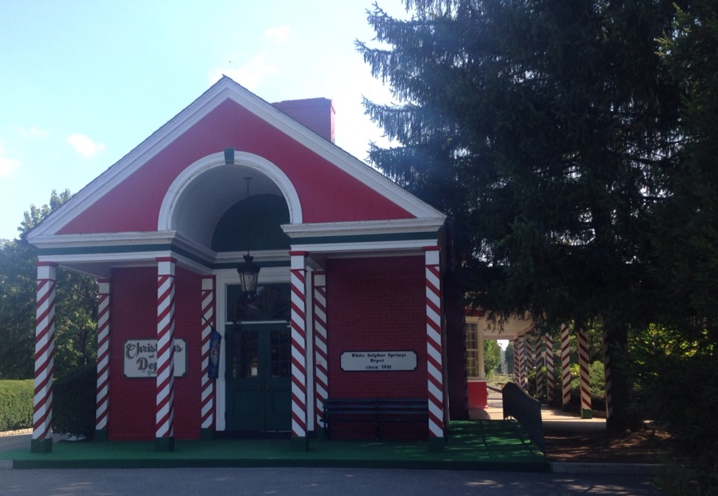 Our first experience of the Greenbrier was unexpected. We stopped to check out the Amtrak Station in White Sulphur Springs and stumbled onto an amazing Christmas store — run by the Greenbrier.Walking up to the hotel -– if you don’t want to stay here you can rent one of the cottages or houses on the property.One of the many floral landscapes on the propertyThe ballroomThe bar off of the ballroomThe indoor pool in the hotelA view of some of the grounds from the north entranceA group getting ready for horse riding — the resort also offers Segway tours, tennis, golf, skeet, spa servicesPart of the golf course at the resortA cute sculpture near the club houseThe infinity pool — and gorgeous view