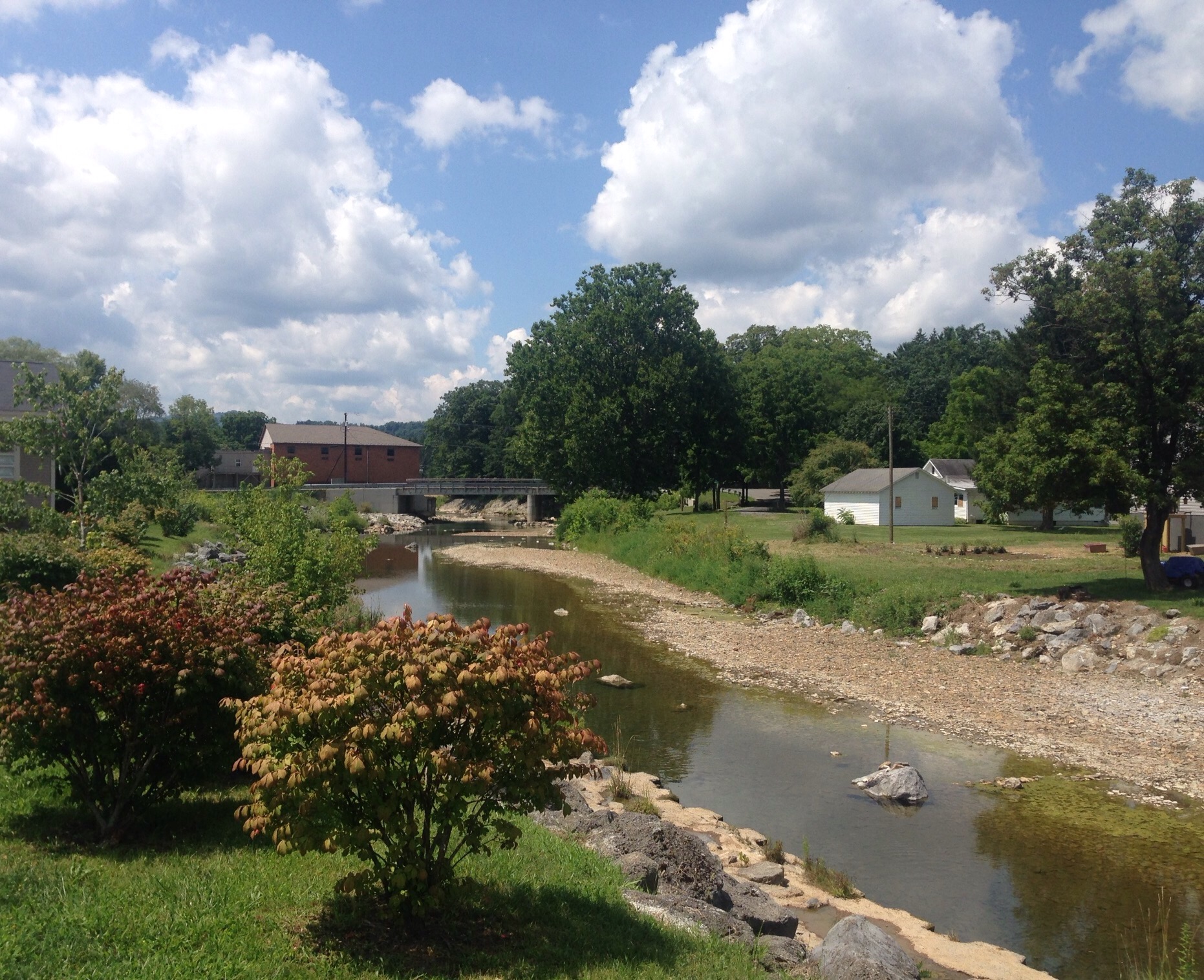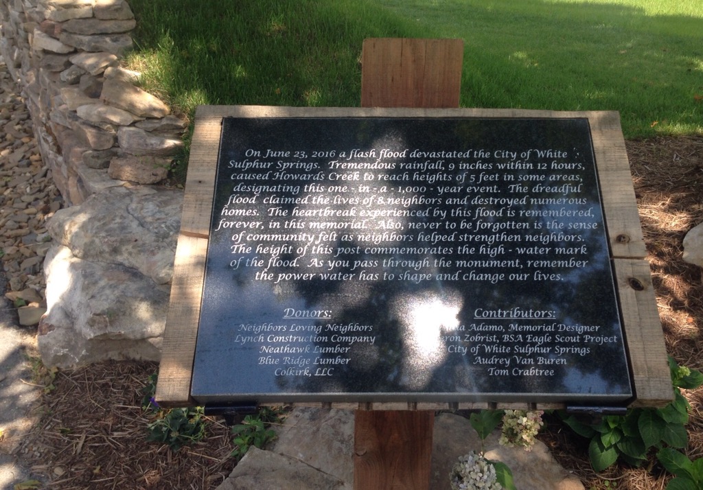 The sign about the flood in front of the stone bridge memorialThe creek level when not floodedA historic building in the park with the memorialA nice message from city hall