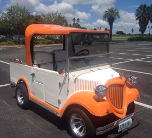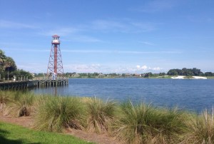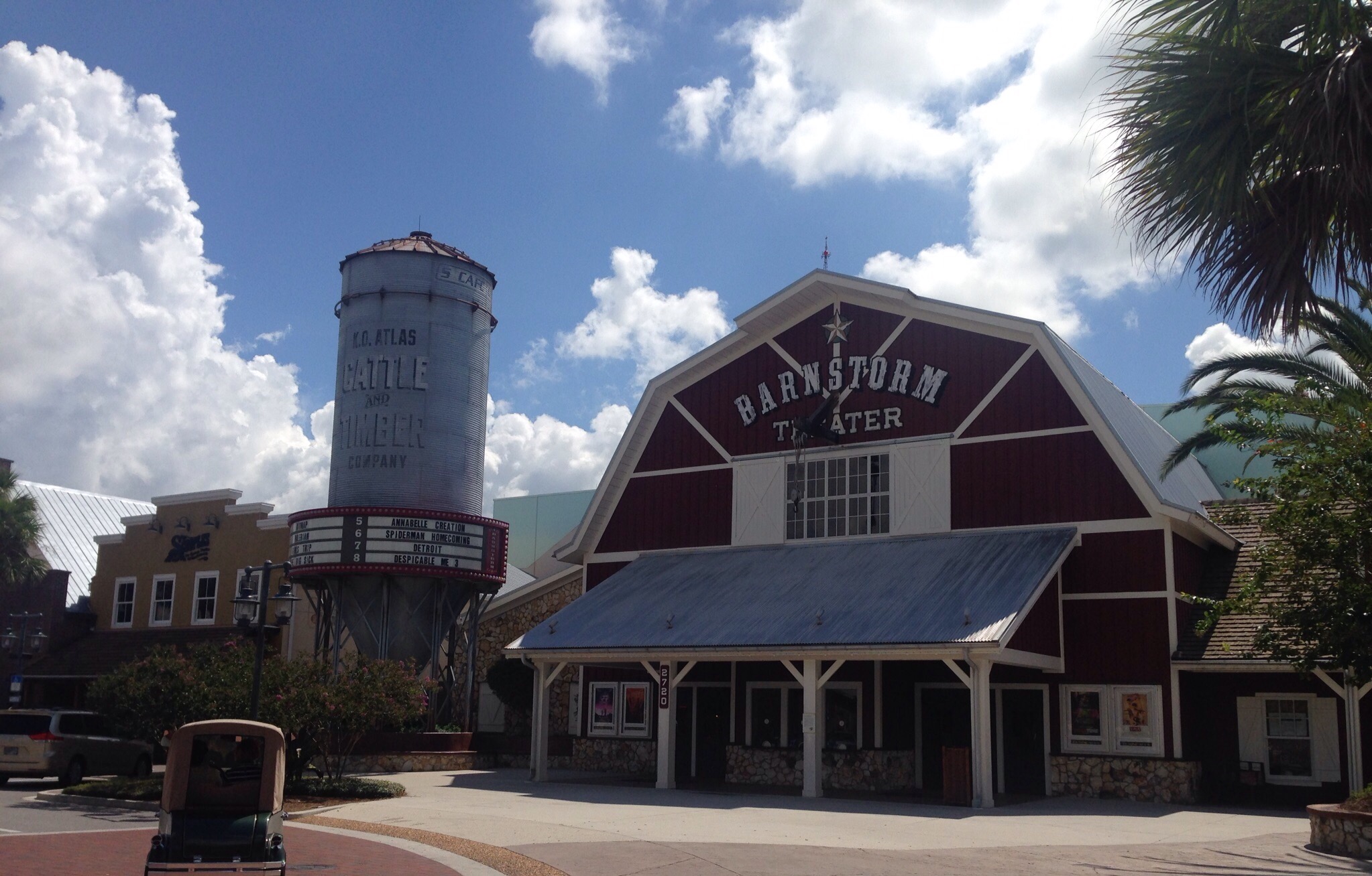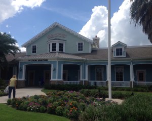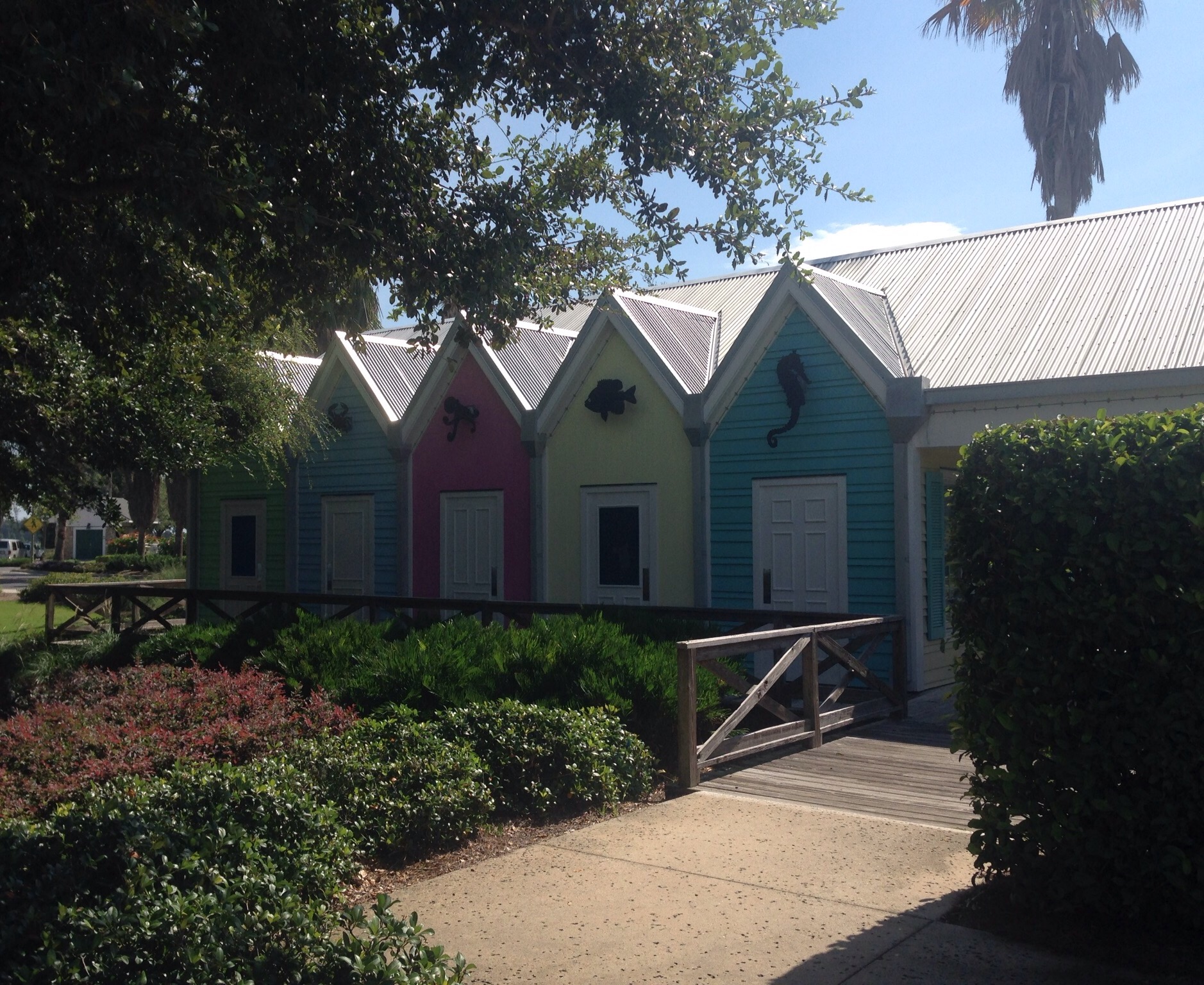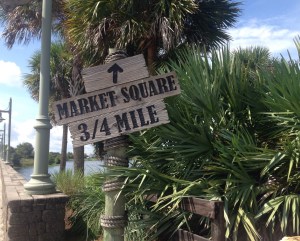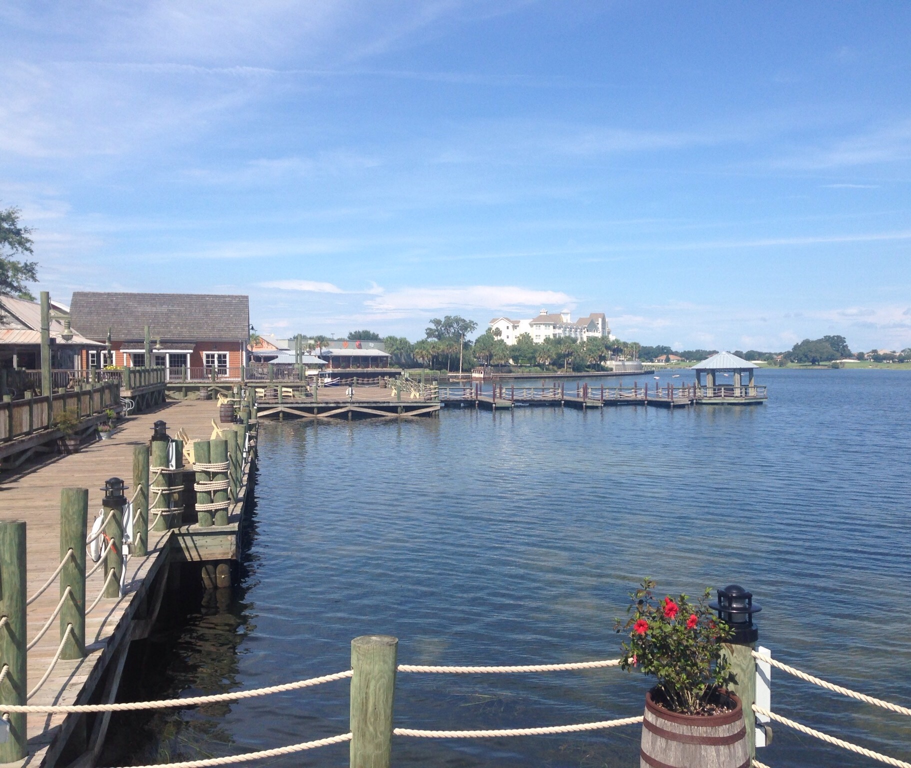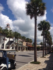 Our current mode of transportation — our homeowner played football for Tennessee. We get lots of positive comments on it, so they aren’t the only Vols fans in the ‘hood.Music on the square on Friday night — a Jimmy Buffet cover band who had a bigger group up dancing later on.A view from the golf cart – one of my favorite things here, a Live Oak tree with Spanish mossWalking along the pier at Market Square at Lake Sumter LandingEverything is attractive here — even the public restrooms!Continuing our meander around the lake — the lighthouse is associated with a seafood restaurantA sign for Market SquareThe community rec center where we have used the fitness facility. The fitness center is great. The main area is also cute but looks a bit as if it was designed by Laura Ashley on speed.