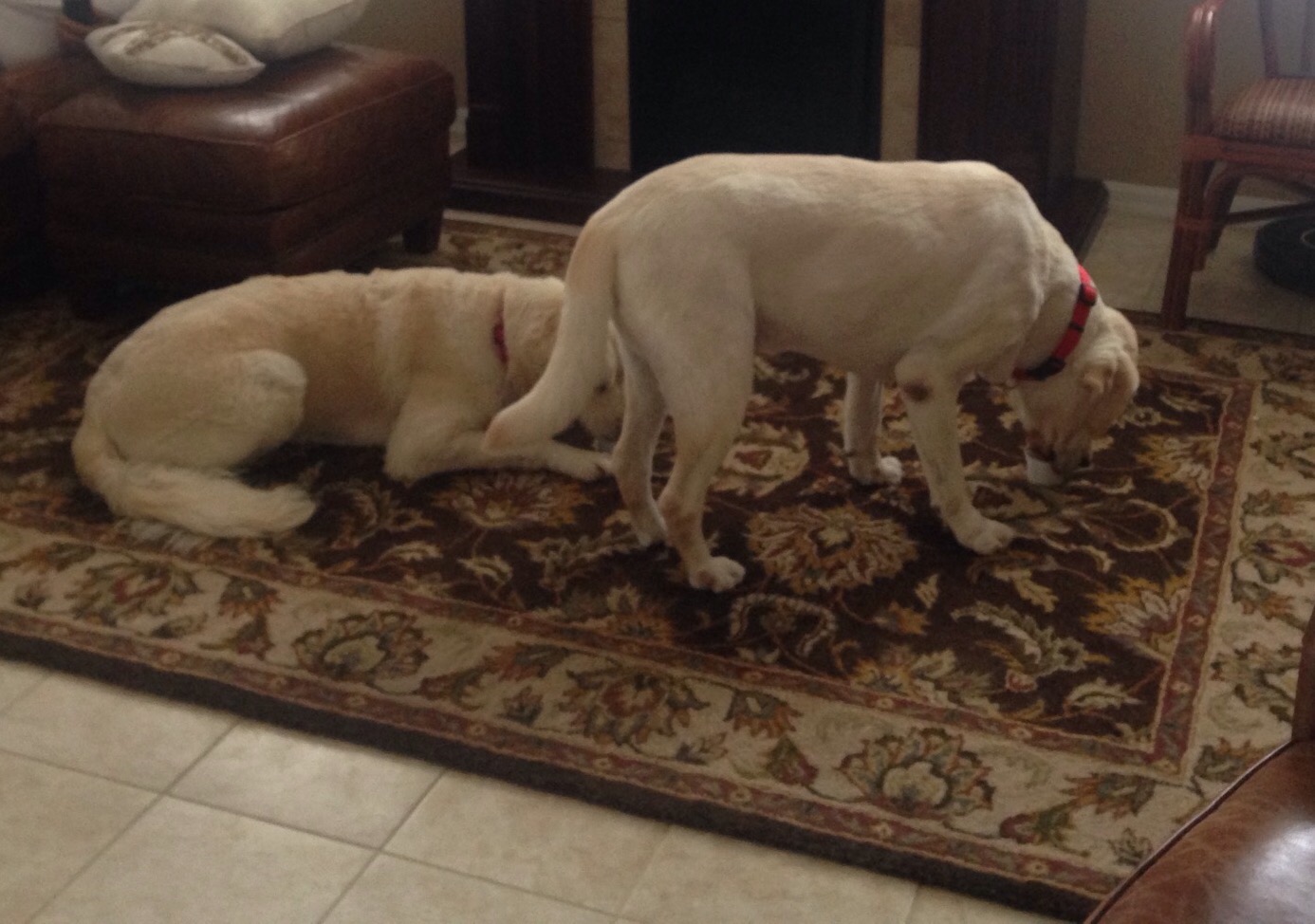 Bob and I are living the good life in The Villages, Florida, a retirement community about 45 miles northwest of Orlando. It is an active area with over 36 golf courses, and we are learning how to tool around the area in the home owners golf cart. We had a lovely transition with the owners on Thursday evening before they headed off Friday morning. We are caring for their beautiful home and caring for their 2 great dogs — Reagan, a 9 year old Labrador Retriever, and Winter, a 3 year old Golden Retriever. They are sweet, sweet dogs who love their ice cream and peanut butter treats. Walks and chasing geckos is pretty okay too.