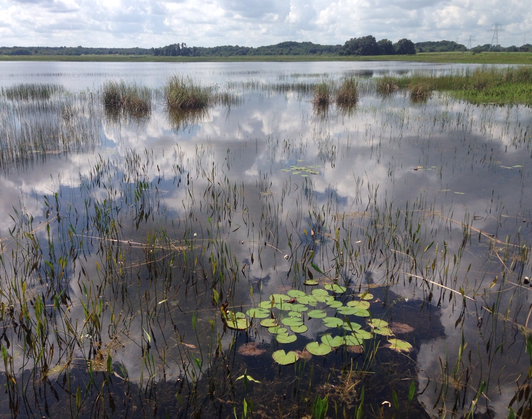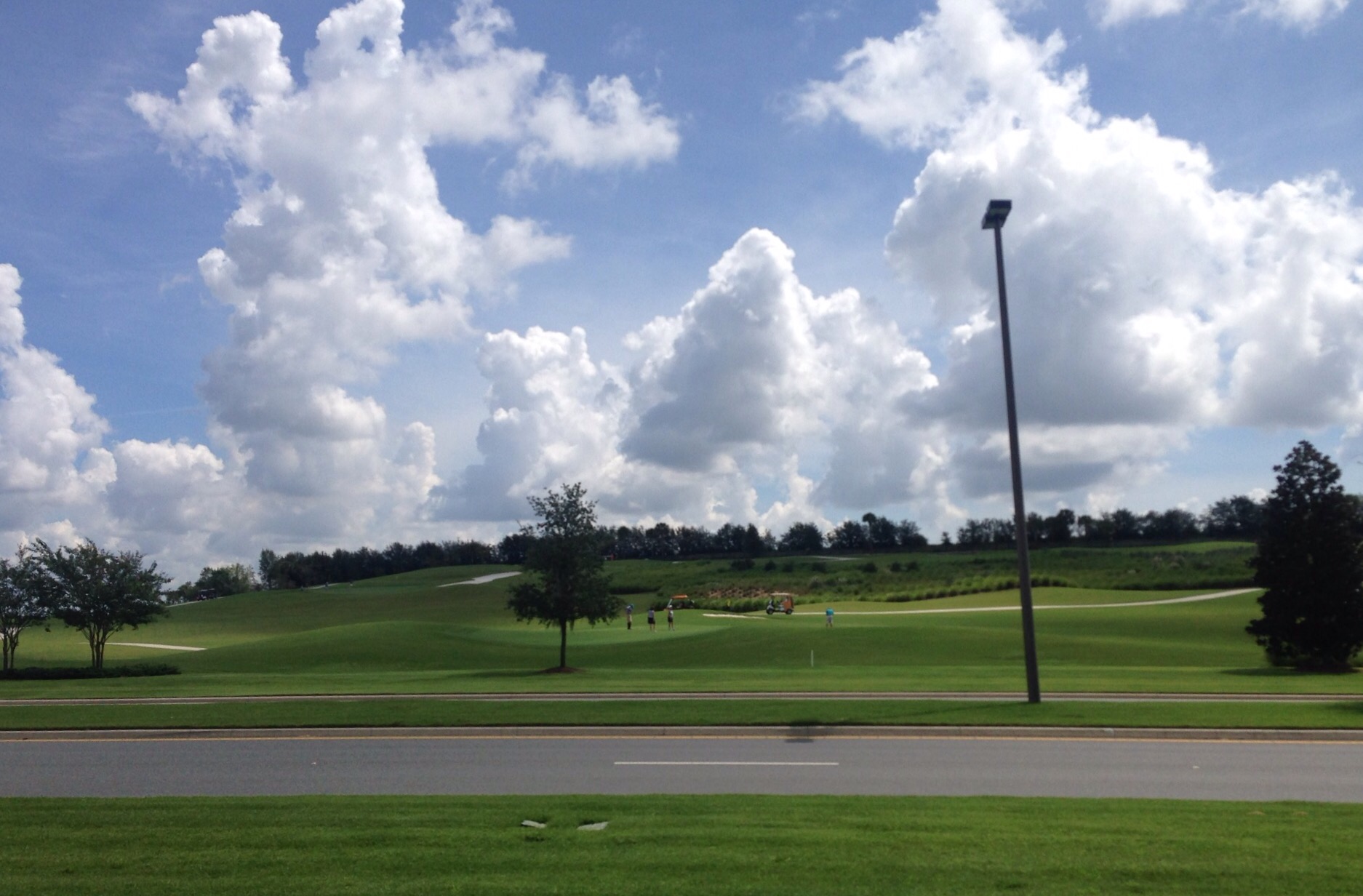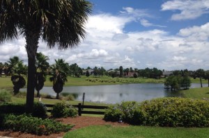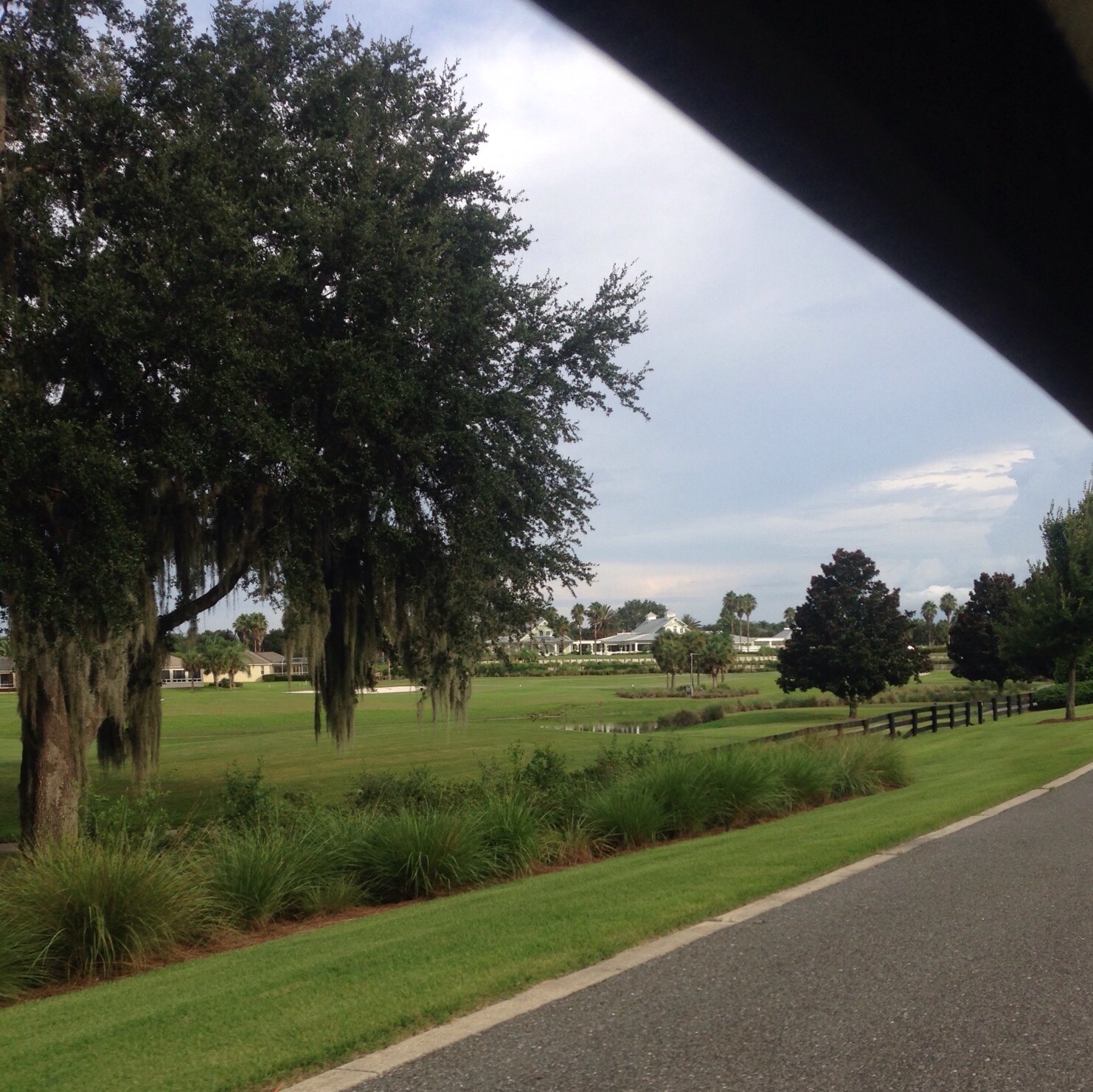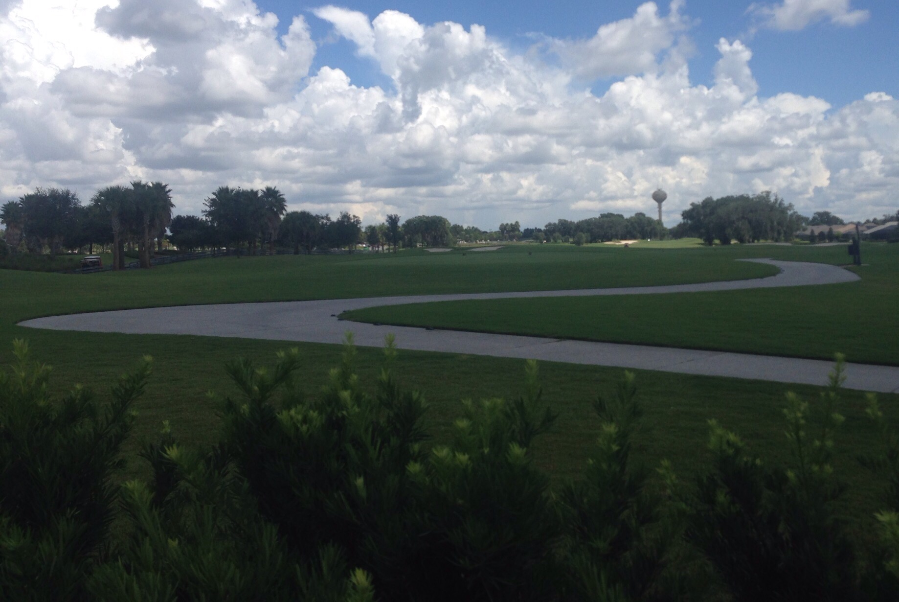 One of the many local lakesLooking across a golf course to one of the neighborhoods with its water towerOn a golf cart path along a main roadAnother golf course