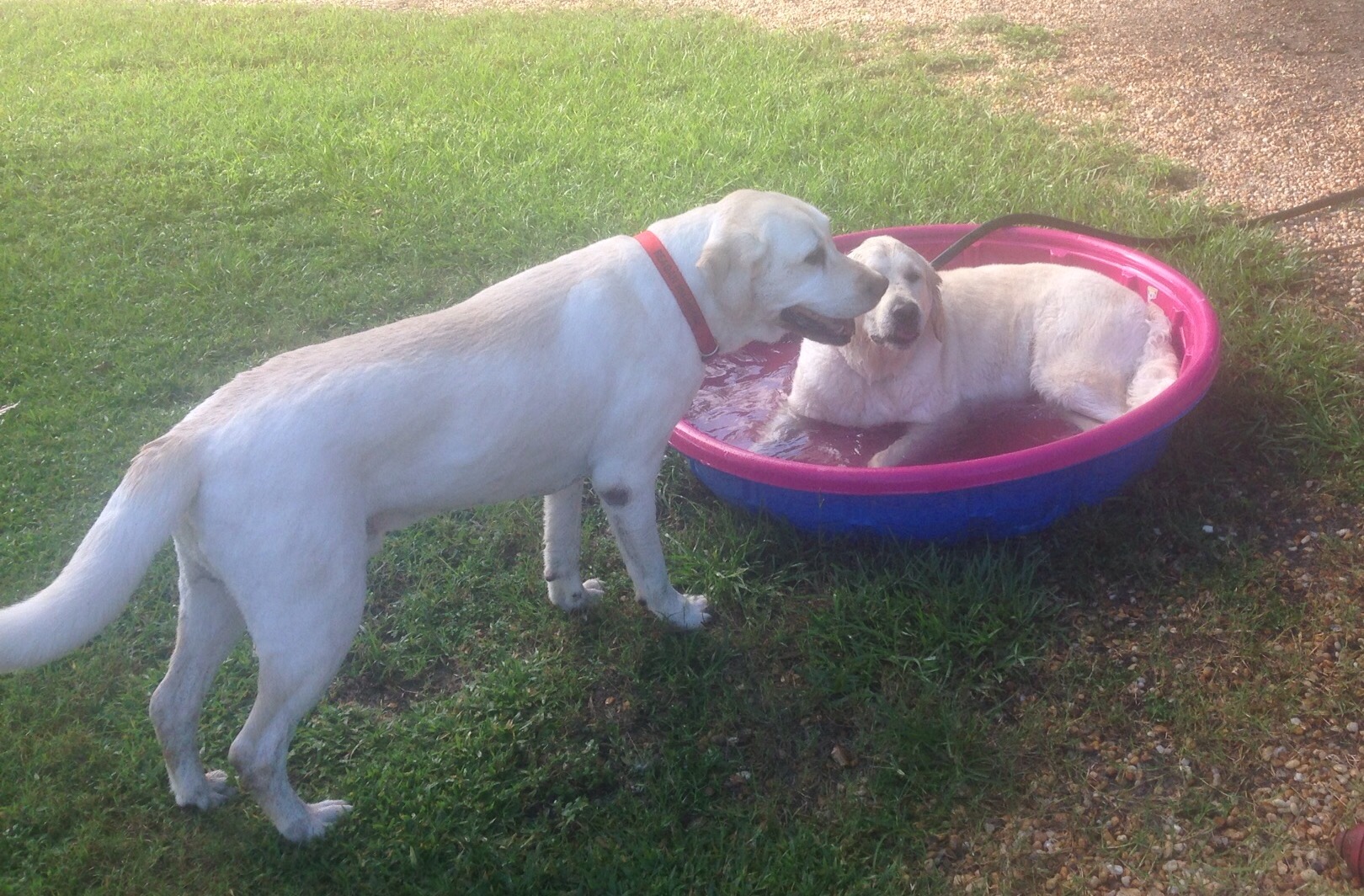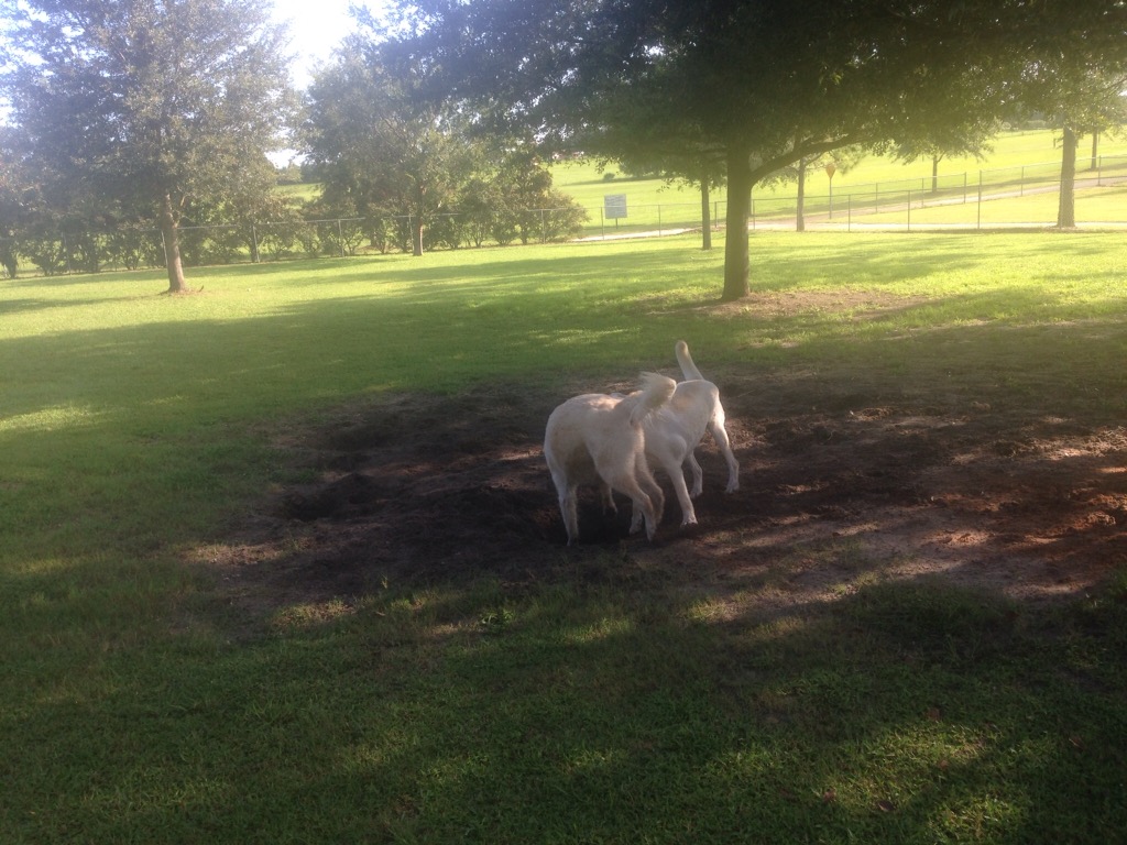 Digging in the dirt at the dog parkTaking turns cooling off in the dog park poolBob and the dogs in riding posture for a trip to the dog park — I get to sit in back