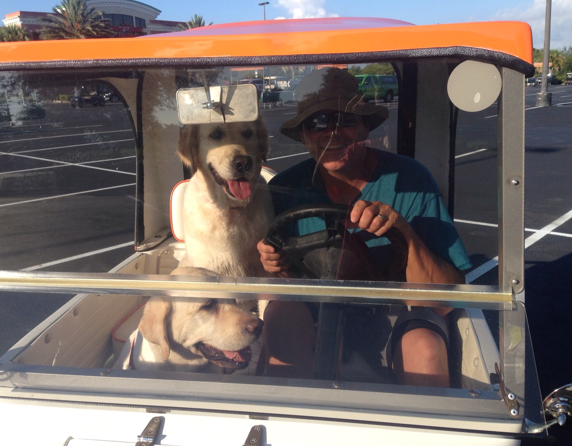 Bob and I have been having a pretty laid-back time in The Villages with our two dogs. We (as in Bob) are now golf-cart driving and parking pros. We like that the golf cart is electric-powered and definitely enjoy golf cart traffic “jams” rather than car ones. We have also bonded with our sweet dogs who enjoy treats, play time and/or walks, and time at the dog park.