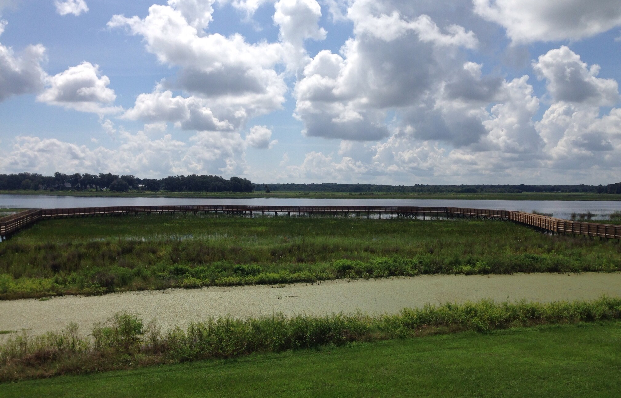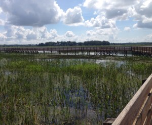 We found a nature center to visit as well. The Sharon Rose Weichens Preserve is a wildlife refuge in The Villages.A Live Oak tree with Spanish moss at the entrance to the preserveThe boardwalk around the preserveA lone duck in the lagoonAnother view of the boardwalk and the waters as we walked aroundLooking past the boardwalk to the surrounding neighborhood