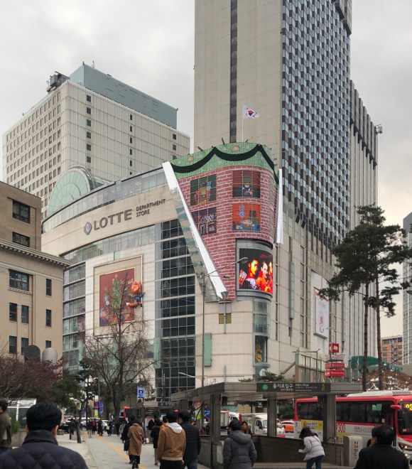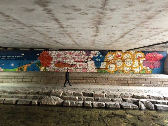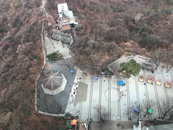 We said good-bye to our tour guide at the market and walked back to our hotel for a quick break before heading to the Seoul Tower. Bob found us a different walk back (Note: He’s using the Naver navigational app here as Google Map does not provide as detailed directions nor have many English translations. The Naver app even tells you about stairs, escalators, underground passageways, etc.) that took us along a stream in a pedestrian area below street level before coming back up.