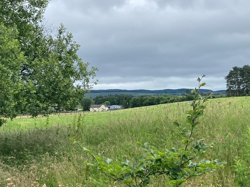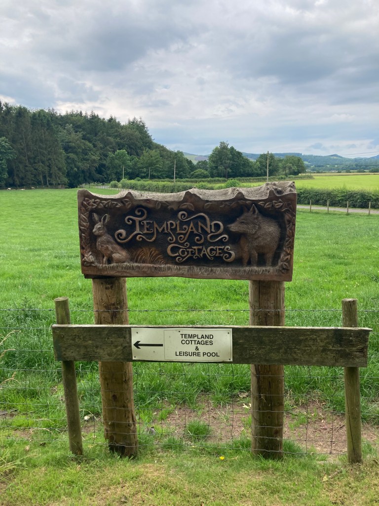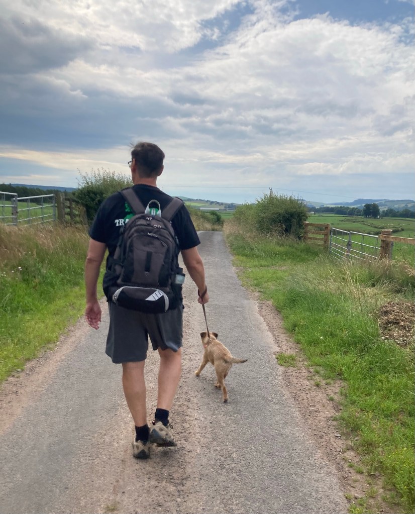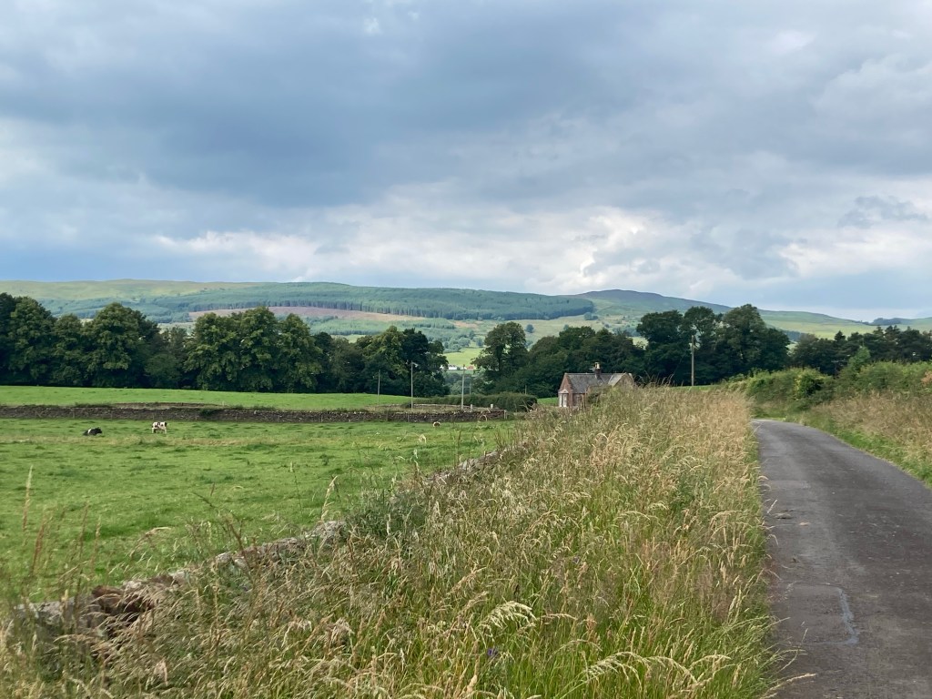 A lovely advertisement at the beginning of our walk.Bob and Otter on today’s walk.Otter and me on today’s walk.The beautiful countryside around Thornhill.Heading back into Thornhill.