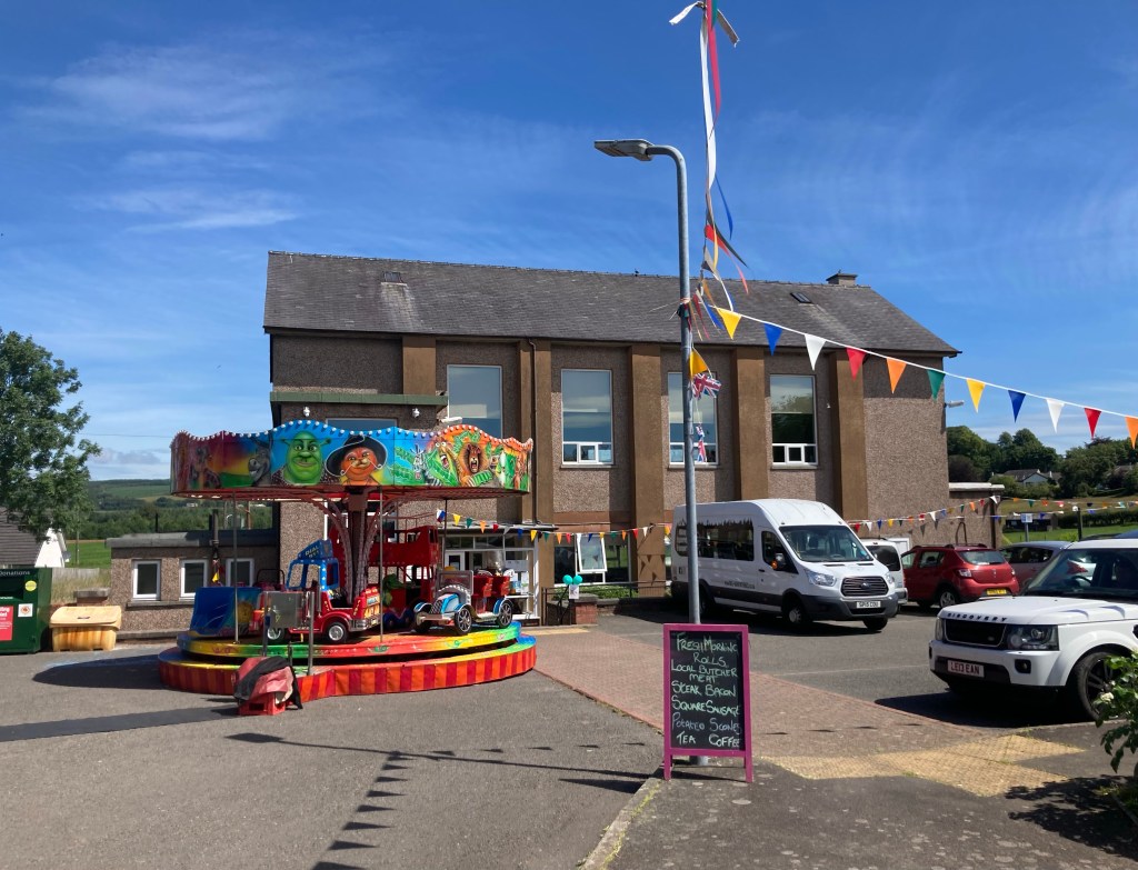 The community center and carnival ride.The fancy dress judging area and tents with food and raffle items. There were also tents with individuals selling craft items as well.