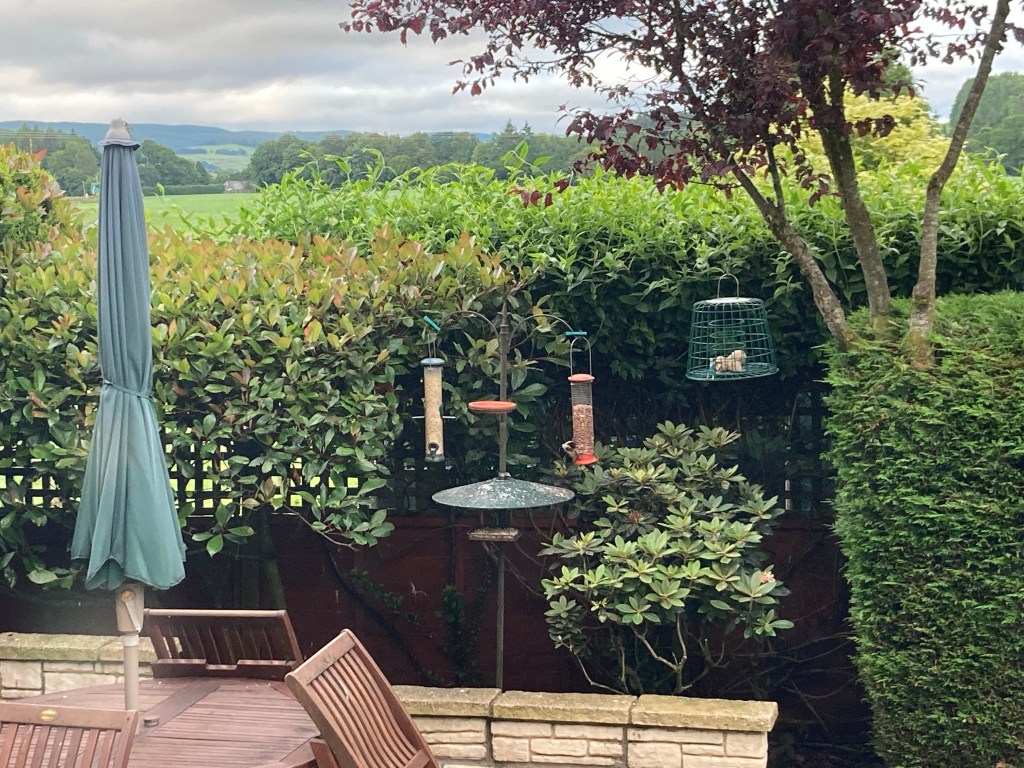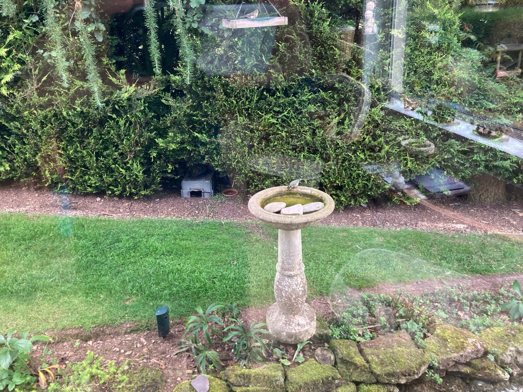 Part of the beautiful back garden. If you look closely, you can see the woodpecker on the feeder with the peanuts.My poor attempt to capture the birds on the birdbath and feeder through the window, as they fly away when I go outside.