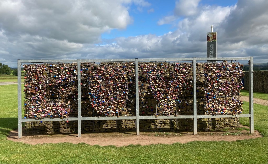 Signs to guide you to the other buildings on the campus.One of many statues in the courtyard.Another statue.The Love wall made out of padlocks.On top of the platform in the middle of the maze.Overlooking the maze and the surrounding countryside.