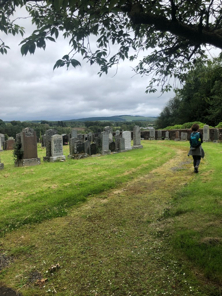 Shaded drive into (and out of) the golf course. We love all of the stone walls. This one’s quite moss covered.We passed some horses on the way into town. This one caught our eye.Walking through the cemetery. Another view.