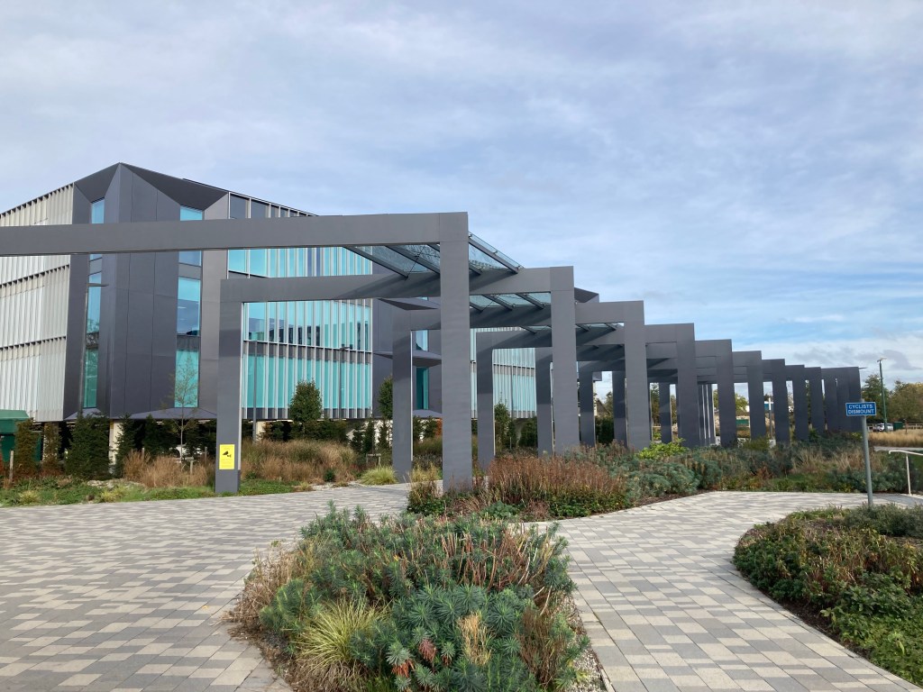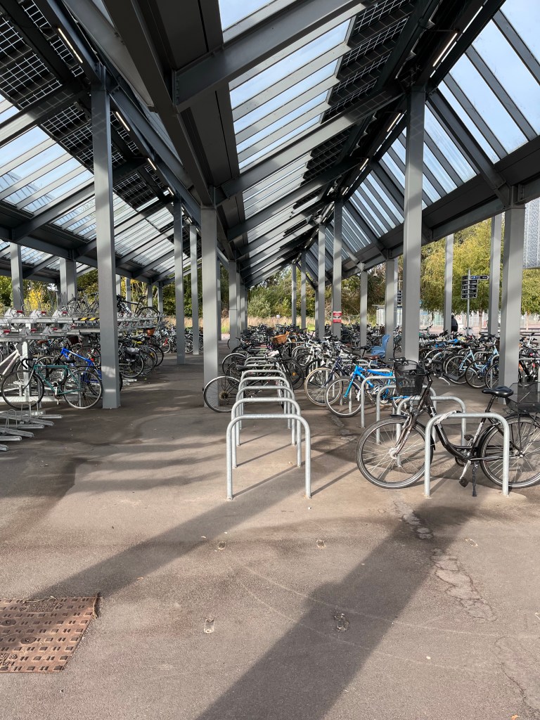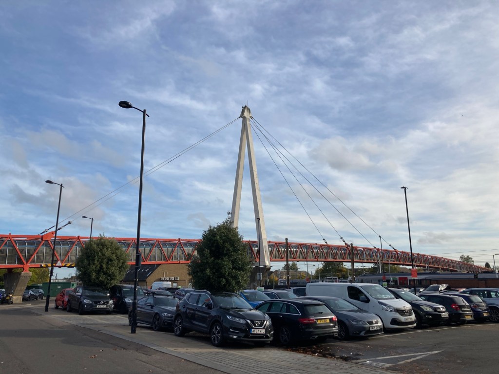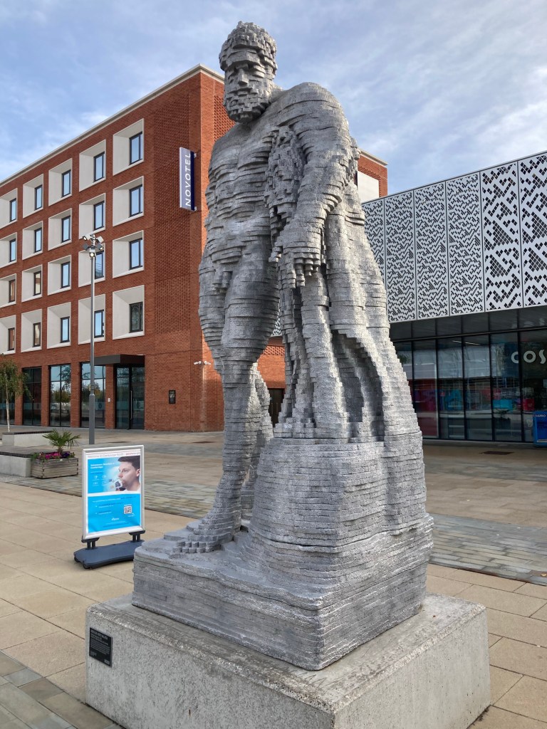A cute tea room in the Cambridge Rail StationA pedestrian and bike bridge near the Cambridge Rail StationPublic art near a shopping centerSignage directing us to the Cambridge North Rail Station and a plea from Wes.On towards the river trail and Cambridge North, but first, cows.A view of Cambridge North Rail StationCambridge North Train Station’s massive bike parking.A Herculean statue (or a statue of Hercules) in front of the Cambridge North Rail Station and a Novotel hotelAnother statue in front of the train stationA drop off/pickup point for buses in the guided buswayA new building along the pathA pond in front of Cambridge Vocational SchoolThe Station House Pub in the renovated rail station in HistonCrossing signals for horse riders, something I’ve never seenA mural on a building where we ended our outward bike trip in Oakington