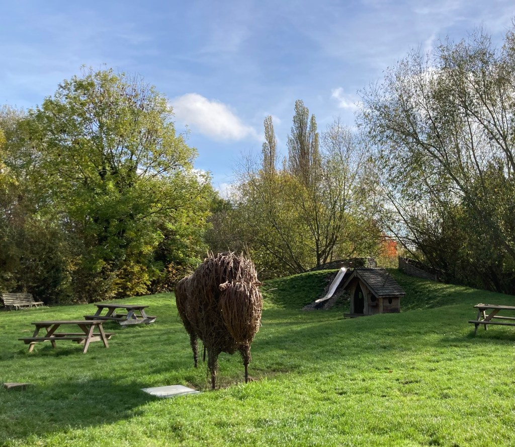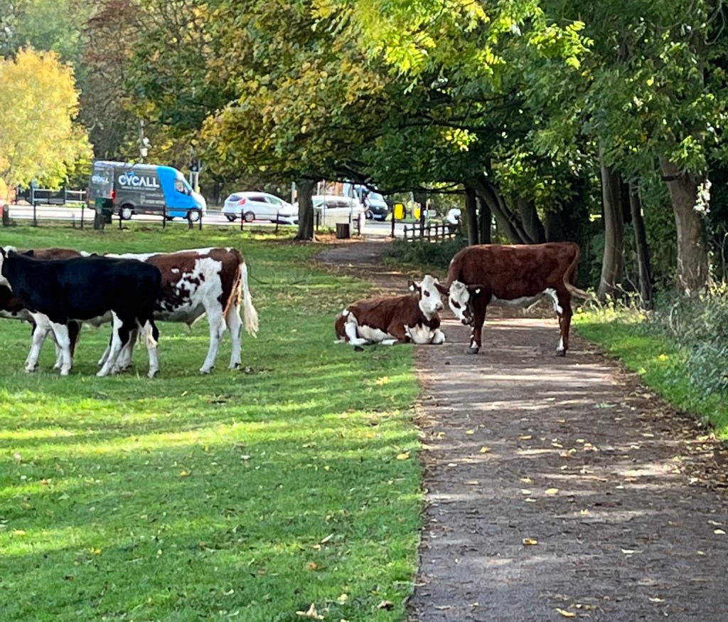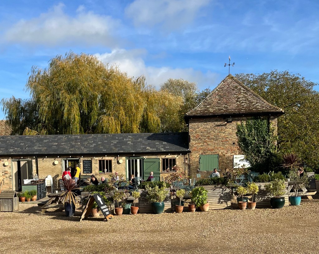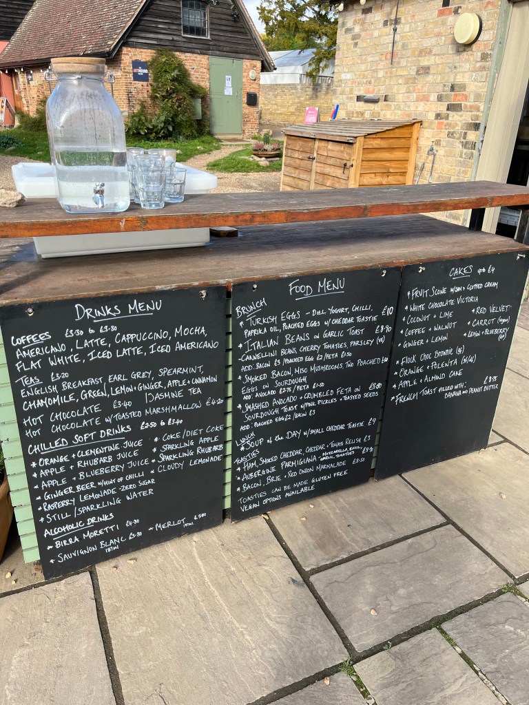 The route started through Sheep’s Green near our house, and the cows were also enjoying the trail.On our way on a nice bike/walk trail.We passed a nice looking pub.The Cambridge Polo GroundsEntrance sign to the farm marketThey had good bike parking. We saw two other cyclists at the farm shop.A stick buffalo sculptureIn front of the grocery, deli, and butcher storeAging beef at the butcher’sThe fish monger and his vanThe courtyard and some of the other storesOutdoor seating at the cafeThe cafe menuA city welcome sign coming back into town.The cows were ruling the trail on the ride back to the house as well.