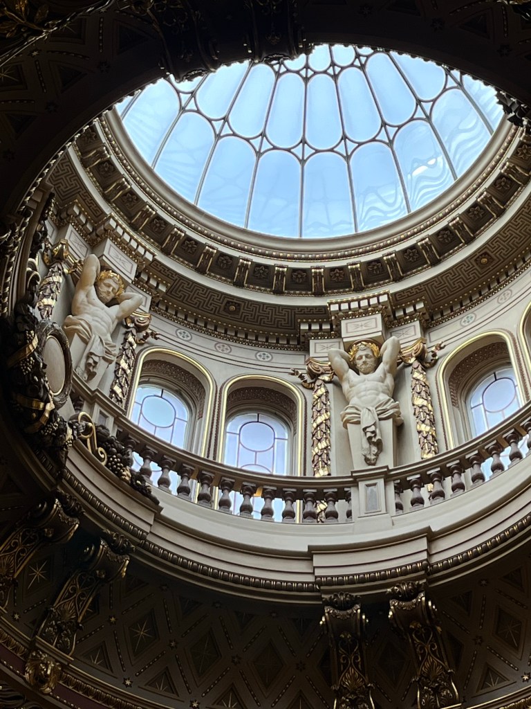 The Fitzwilliam Museum with columns adorned with posters for their Defaced! Exhibit (more below).The lovely main entry hall and rotundaLooking across the top floor over the main entry staircase The mosaic floor on the upper level of the entryThe top of the rotundaThe beautiful room that displays European artAnother stairwell with views of the University of Cambridge Judge Business School