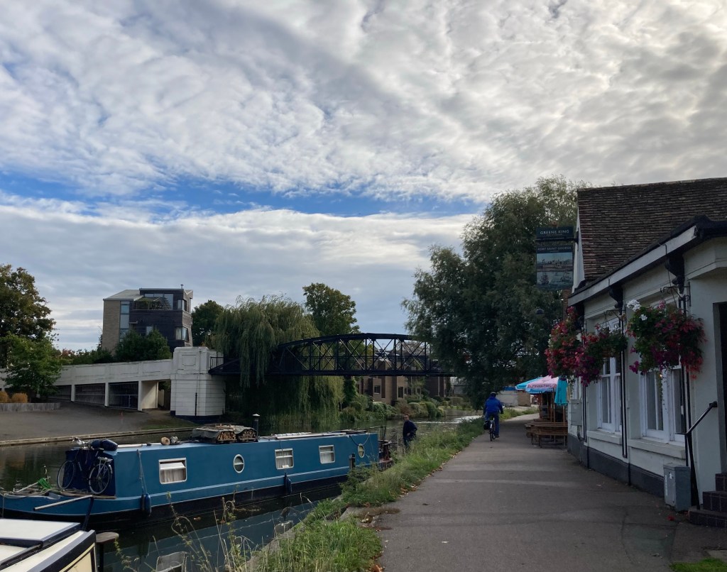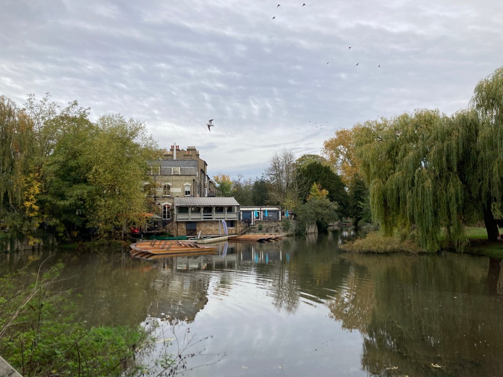 A punter on the River Cam as it flows through Sheep’s Green (but which has cows and no sheep)The trail along the River Cam in Sheep’s Green, headed towards the Fen Causeway and onto Mill Pond.Mill Pond, located near a 19th century mill which is now a pub called The Mill.Clare College Memorial and Ashby CourtAnother pub, not sure why we feel compelled to photograph so many of these, but we tend to find them attractive, and it’s cheaper than stopping for a pint.A couple of restaurants/pubs across from Castle HillCastle HillLooking into town from the hillLooking away from town