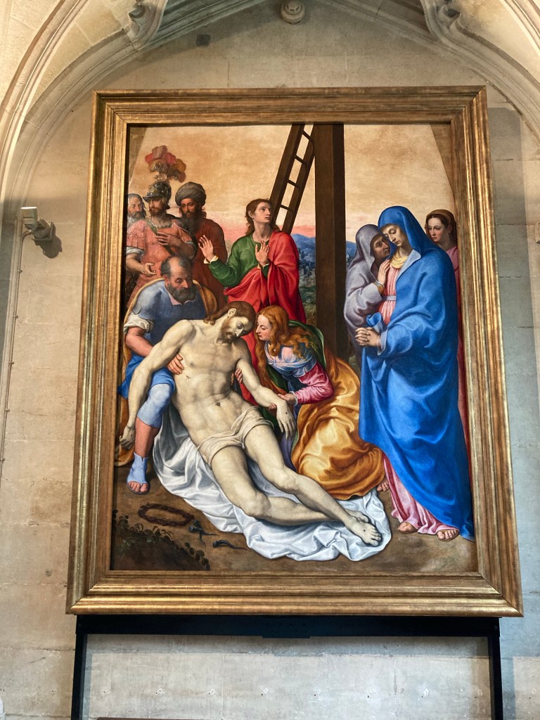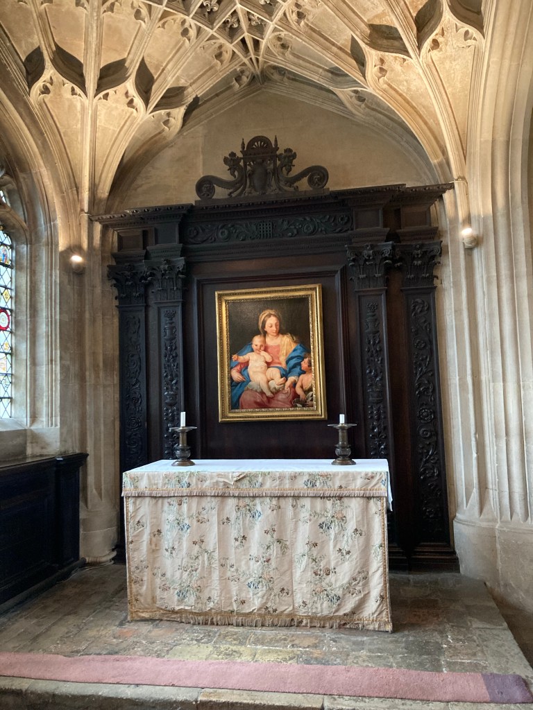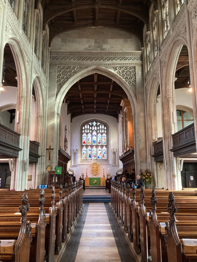 Looking back towards the Gate House, where we entered the college grounds.The view upon entrance onto the King’s College grounds from King’s Parade, the green Front Court and the Gibb’s Building. On top of the fountain is a statue of Henry VI, the “boy king.”One side of the chapel. There must be refurbishments underway, as there was scaffolding on one end of the chapel and on the roof.E.M Forster, “A Passage to India,” “Howard’s End” is a King’s alumnus.A view of the chapel with the amazing ceiling and dark wooden choir screen. A pamphlet said the ceiling or “fan vaulting” is the “undoubted glory of the building.” The chapel is almost 300’ long and 80’ high.Beautiful stained glass windows.A painting by Carlo Maratha in the Whichcote Chapel off of the main chapel.Stained glass in the Whichcote ChapelThe painting Deposition of Christ by Girolamo Siciolante de SermonteZooming in on the fan vaulting.The choir area of the chapelStalls in the choir areaThe choir screen and pipe organ.Another shot of the choir area, do you see Beth?A view of the back of the chapelThe River Cam right behind the chapel.