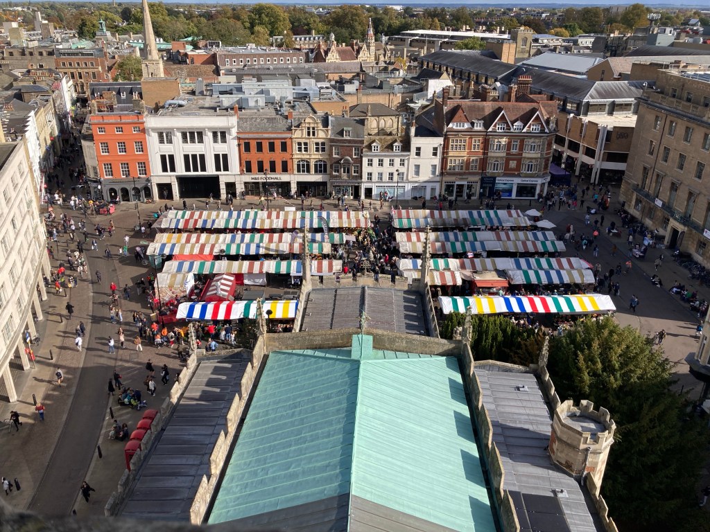 The narthex of the churchThe entrance to the stairs on the roofLooking down King’s Parade, past King’s College and Chapel on the rightOverlooking Market Hill and the marketplaceKing’s College and Chapel and the Senate House on the rightGonville and Caius College in the foreground, followed by Trinity, and St. John’s Collège further backLooking over the King’s College Courtyard. Bob is in center of fence in front of courtyard.The tower’s winding staircase