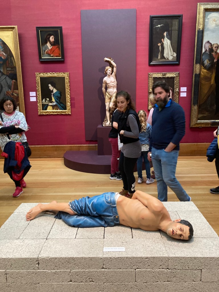 Bob loved the blue in this cabinet from 1625.Beth liked this tapestry chair.And this service set.A special display was called Juxtaposition and compared the body of a young modern immigrant with the statue of a youth being detained against the wall.