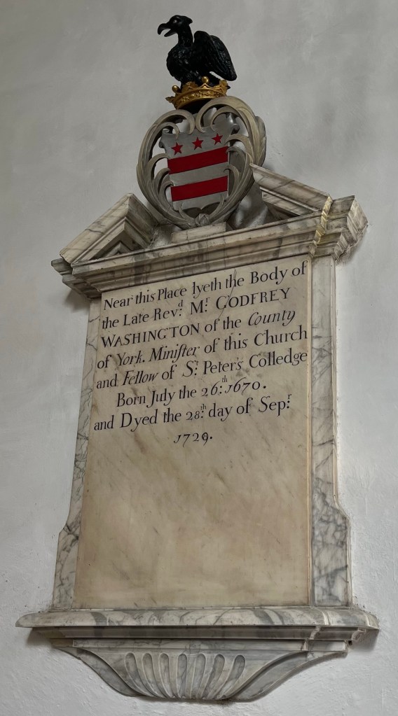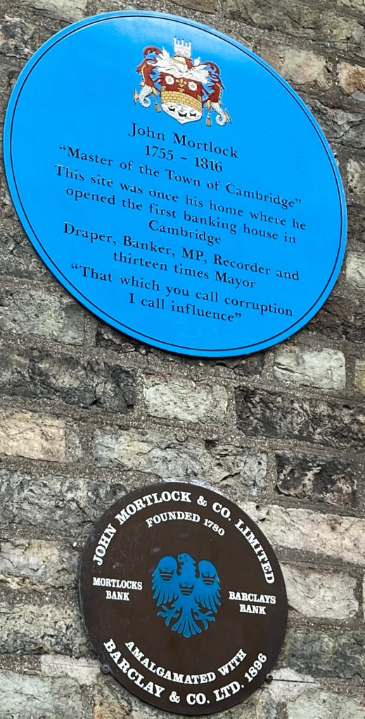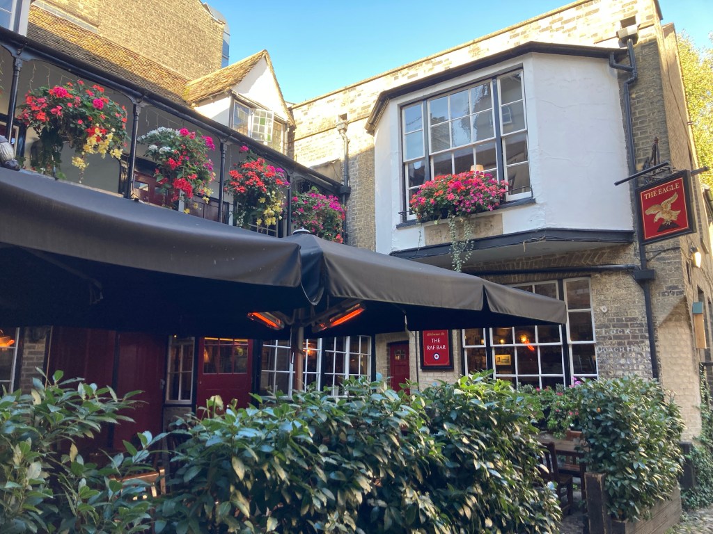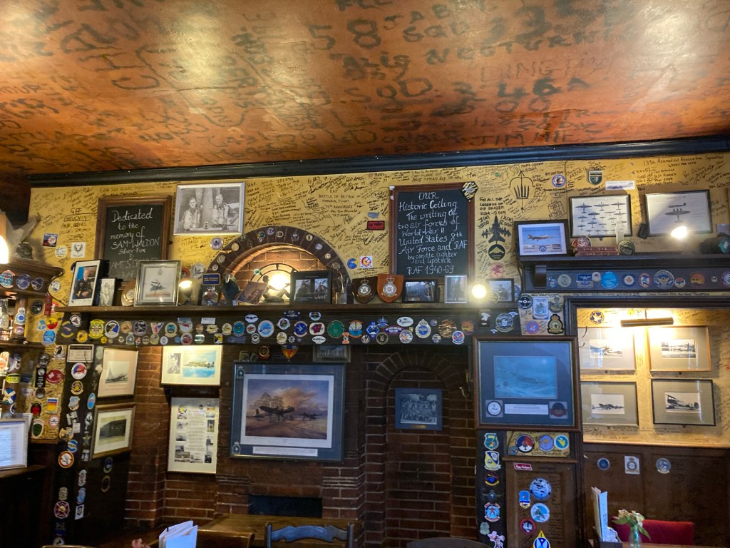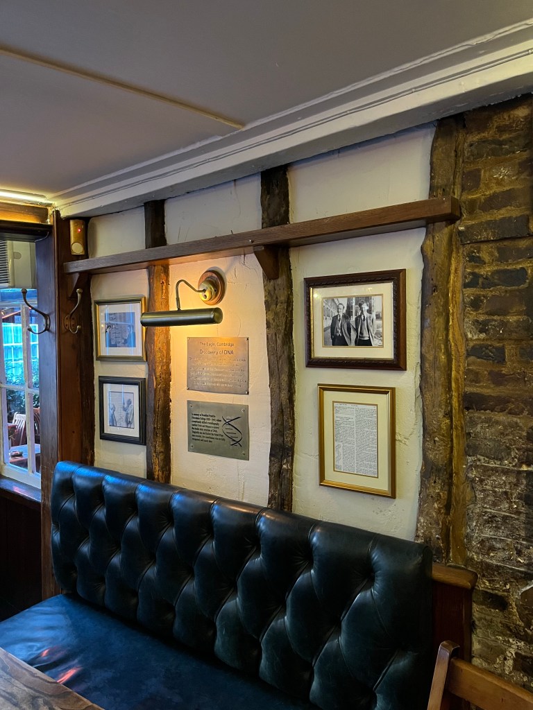 Interesting quote, one embraced by many people in positions of power over the yearsApparently, the home of the last hangman in Cambridge. Note the metal sign showing the number of the house surrounded by a tree and a person with a noose.Little St. Mary’s ChurchA plaque in Little St. Mary’s Church, where the great uncle of George Washington is buried. And the plaque on top may have influenced the USA flag.The RAF Bar. Lots of stories attached to this bar. It was frequented by the Royal Air Force and US forces during WWII.The writing on the ceiling is from the WWII forces. Individuals in the military who show their IDs get to sign the walls.A cute little nook in the Eagle Bar next to the RAF Bar.Plaques in the Eagle Bar where Watson and Crick announced their discovery of how DNA works. Work by Rosalind Franklin, another Cambridge alum, is also now credited with contributing to this understanding as well.