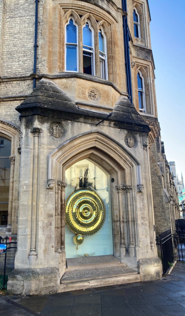 One of the newer features of Cambridge is the Corpus Clock which is behind leaded glass on the outside of the Taylor Library at Corpus Christi College. It was conceived and funded by John Taylor, an alumnus of the college. It is 24 carat gold plated stainless steel. The outer ring shows the seconds, the middle ring minutes, and the inner ring the hour via a blue light. The animal on the top, which didn’t photo well due to movement, looks a bit like an evil grasshopper, but is actually a chronophage, or time eater. The whole work is to remind us of the constant passage of time and to live life while we can.