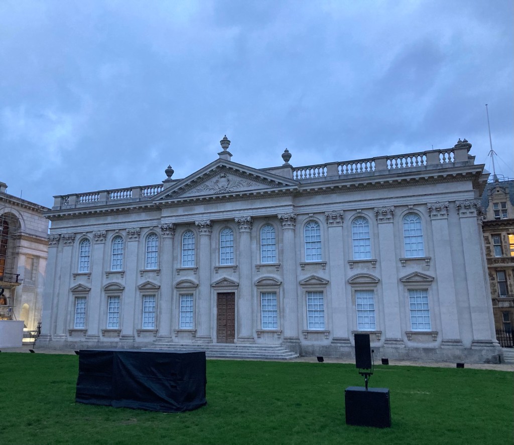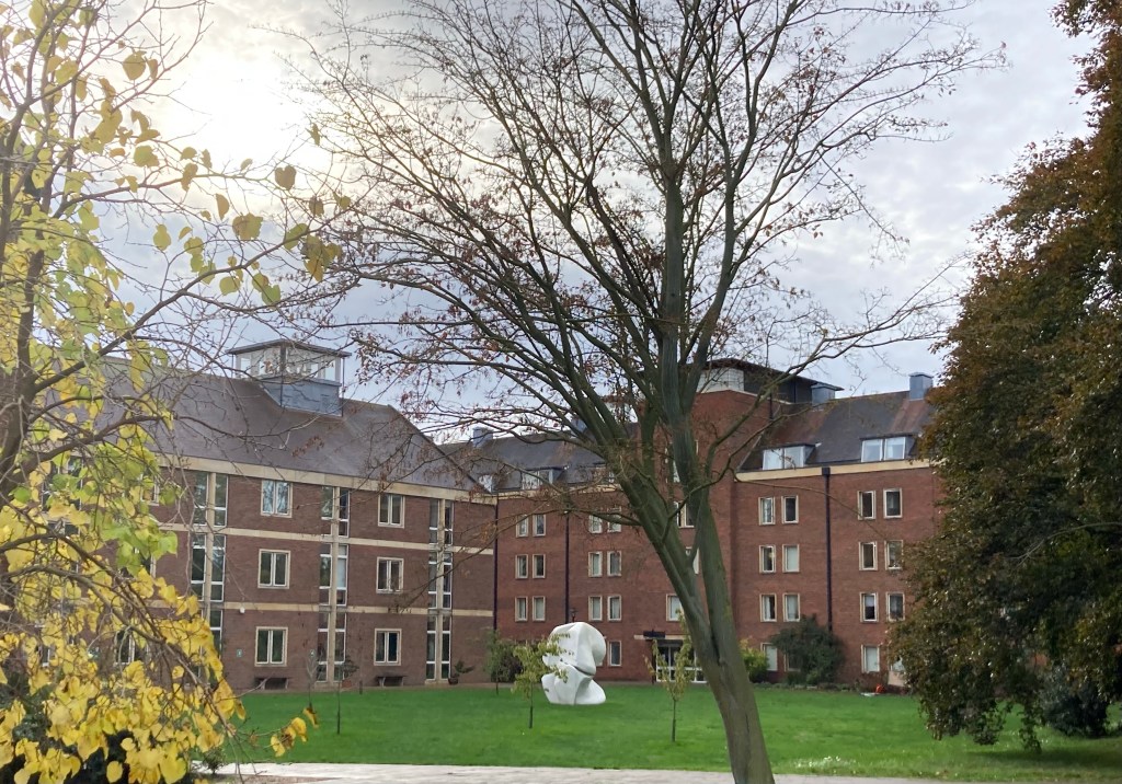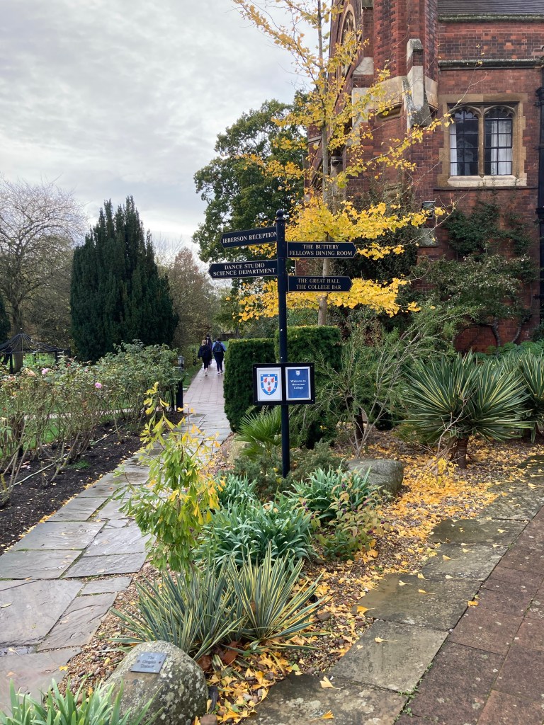The Queen’s Wing Building at Homerton College. The college dates to 1695.A map of the campus and a sign directing us to the Porters Lodge where non-students check-in.A nice sculpture in one of the courtyards.Wall art The Great Hall where the recital was held (through the wooden doors towards the left).Beautiful landscaping and way finding signsA sleek fountain and more landscaping The program for the recitalThe chairs that we sat on with the school motto, which Google translates as “look at the end,” which could be taken a couple of ways in this placement.The talented Mr. Margolis