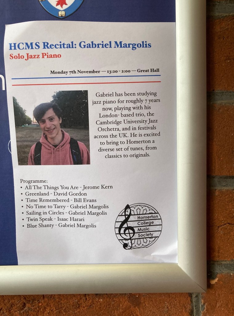 We dipped our toe in the water today and made the short walk to Homerton College for a 40 minute free lunch jazz piano recital by Gabriel Margolis, who we assume is a student at one of the colleges. There were a total of 10 people there to watch, which was almost as many chairs as they had set up.