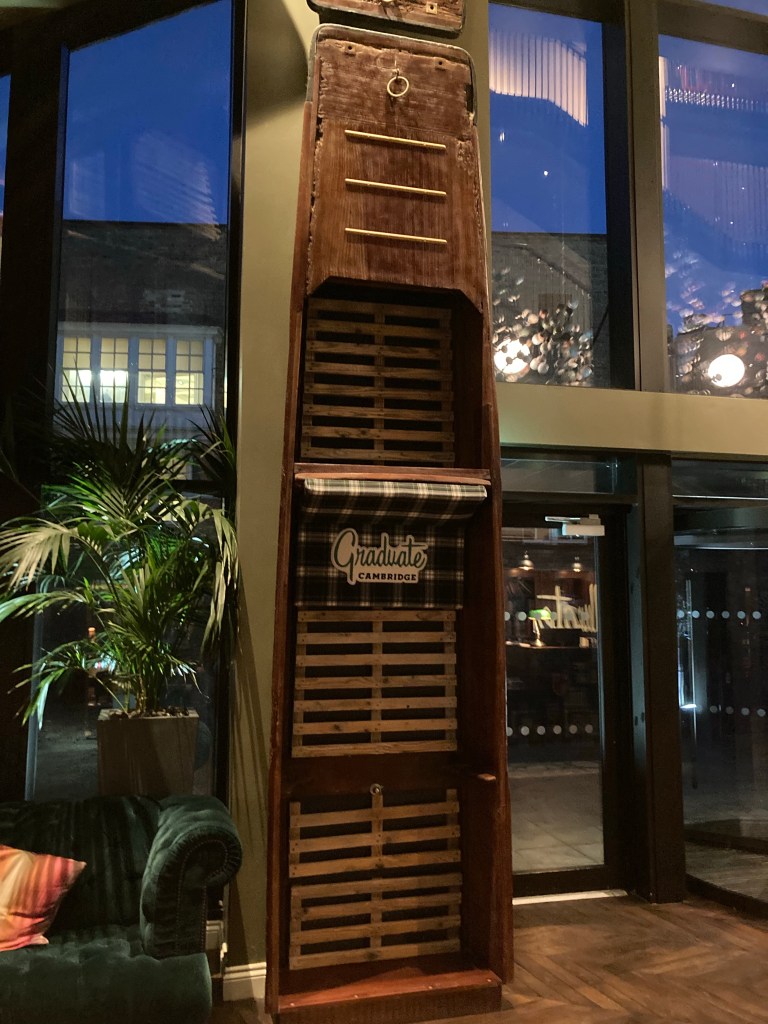 Bob and I added to our Graduate Hotel experiences tonight by having a glass of wine at the Graduate Hotel Cambridge. It’s about a 25 minute walk from the house and sits along the River Cam. This is our 4th Graduate Hotel that we’ve experienced, having stayed at one’s in Iowa City, Iowa, Knoxville, Tennessee, and Columbia, South Carolina.
