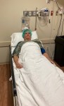 Bob prepped for surgery but without the happy and sleepy juice yet.Bob recovering at the house with his compression socks and loyal feline companion, Pancho.