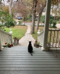 Lefty keeping watch in front of the house.Lefty not happy with me taking a pic while she’s cleaning. Not sure I wouldn’t react the same.Pancho playing on the cat tower in the den.Pancho keeping watch on the porch.