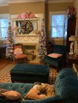 Hollywood back on her pillow in the sitting room decorated for Christmas The tv room with the hair salon inspired lampThe funky bathroom The outdoor poolThe shed and patioThe mini camper she shed.