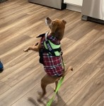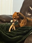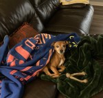 Cooper likes to stay warm.Getting pills disguised as a treat before today’s walk.