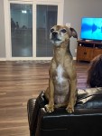 Cooper with the bone he likes to chew — especially when it’s getting close to dinner time.Cooper’s spot to watch what’s happening outdoors— or in the kitchen.Playing fetch with Cooper in the backyard.