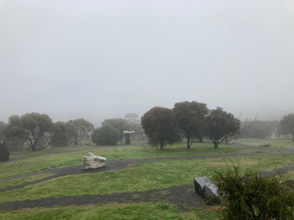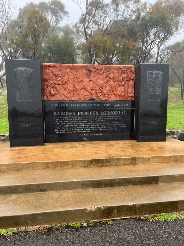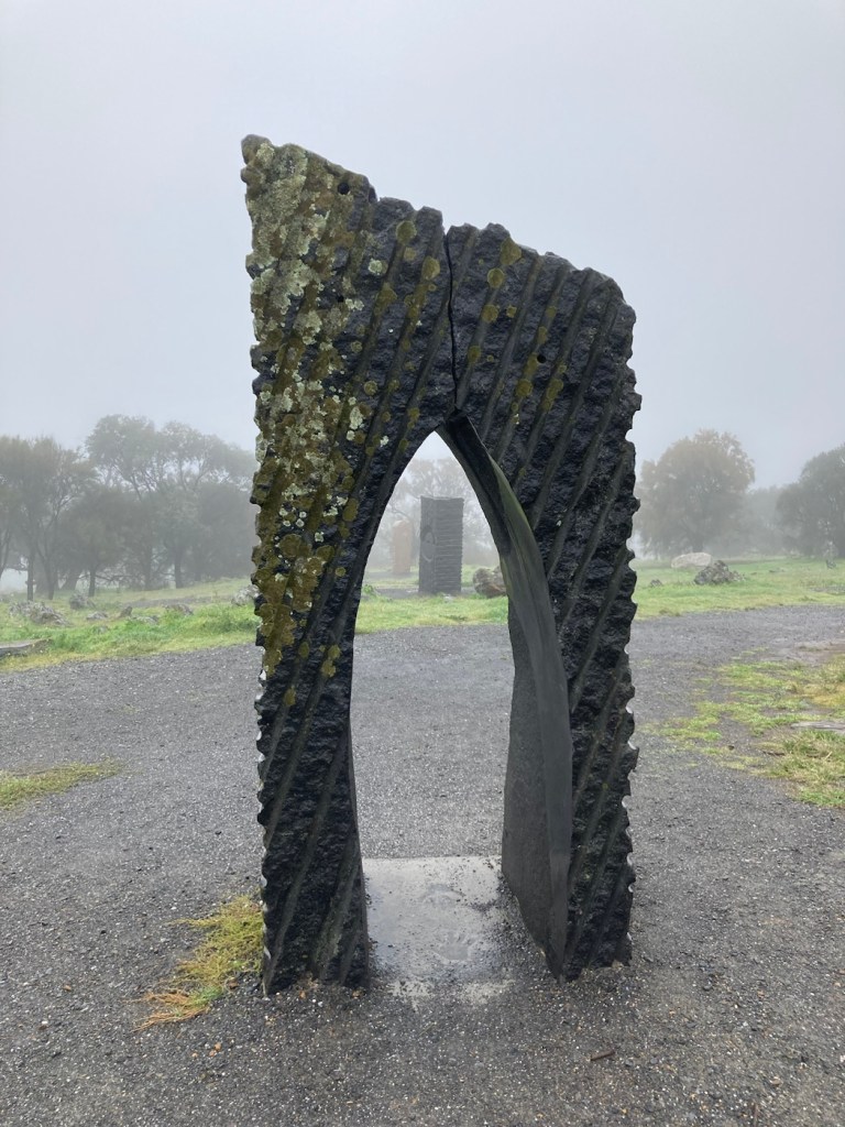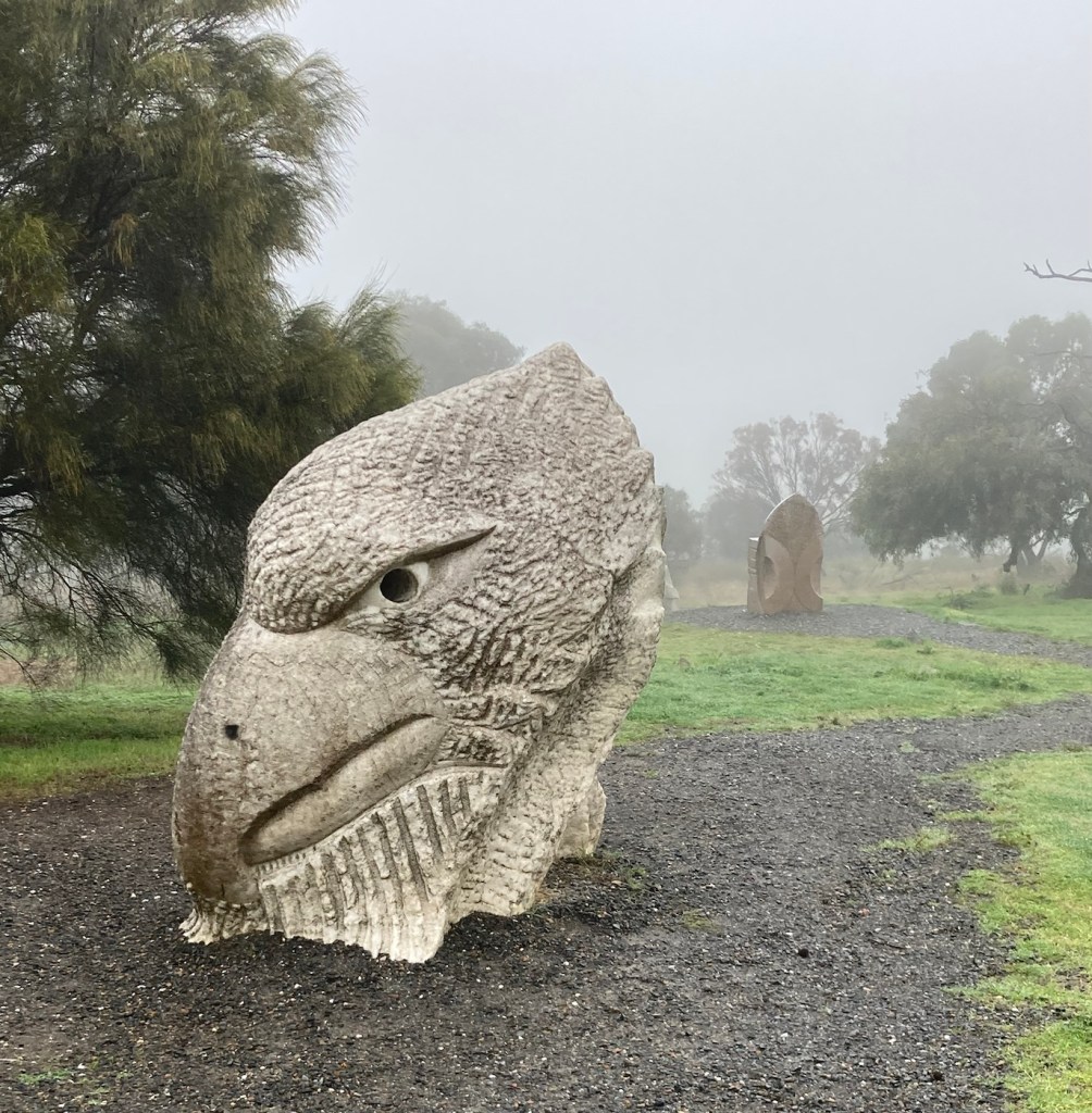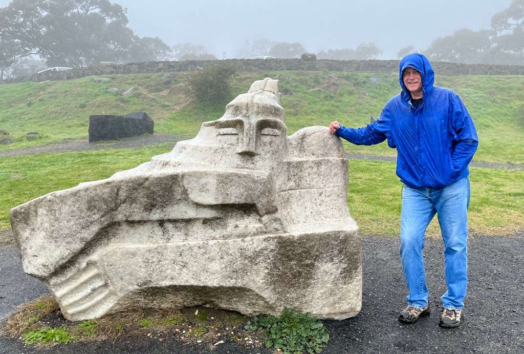 After folding and storing the washed clothes, we decided to go out and about even though it was dreary out. First, we hit the Barossa Sculpture Park by an overlook. The fog/mist/dew didn’t allow for any view to speak of, but we got to check out a few sculptures, including a big head sculpture for Bob.