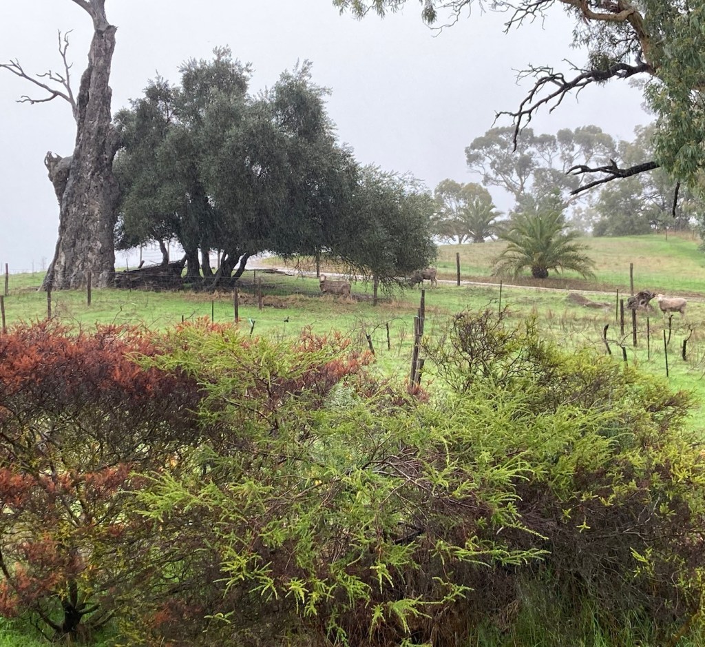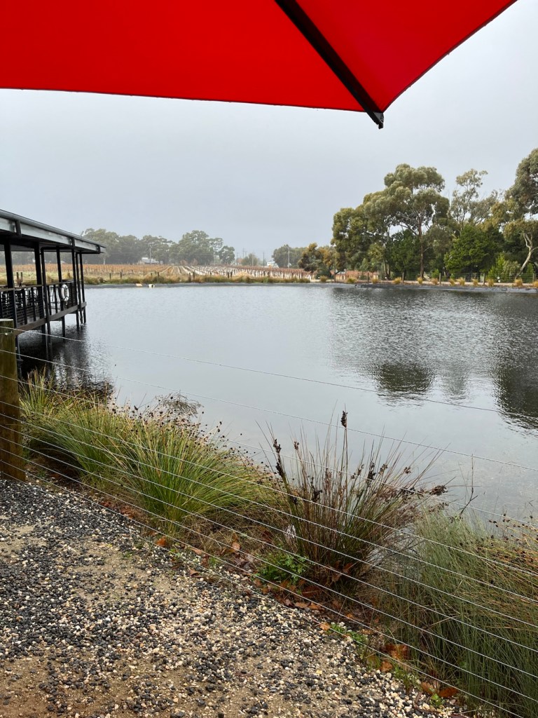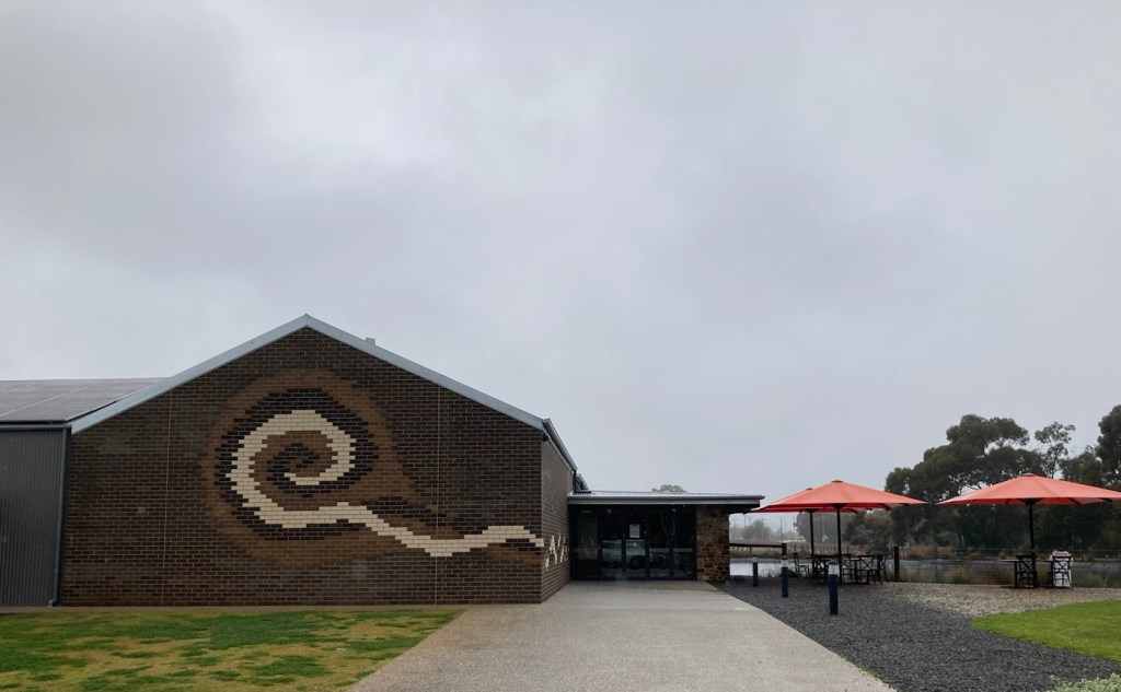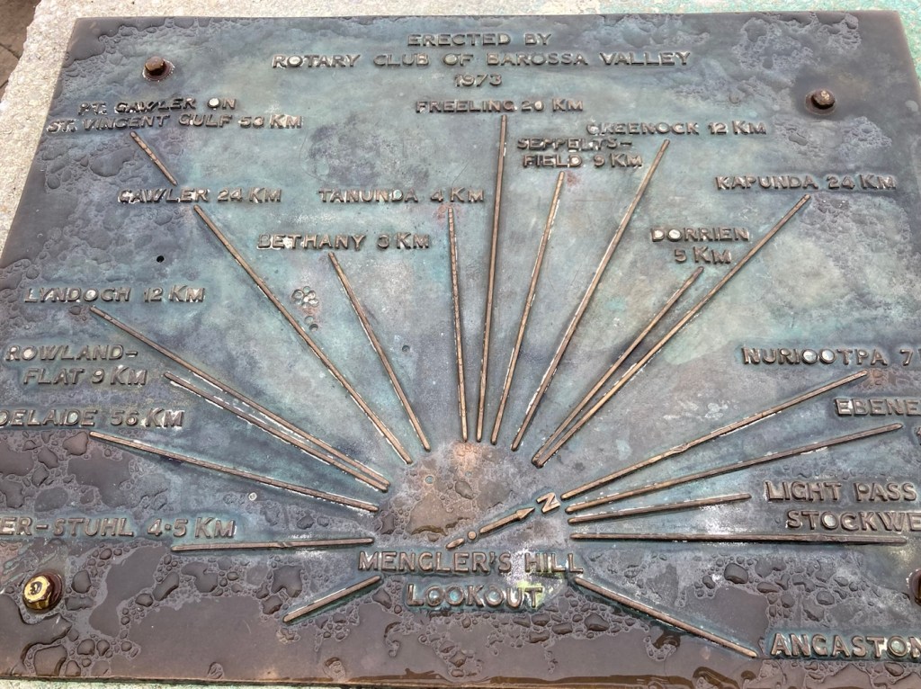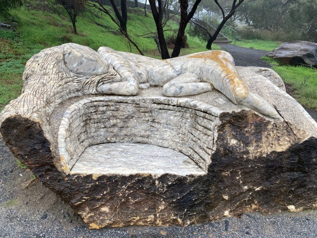 After folding and storing the washed clothes, we decided to go out and about even though it was dreary out. First, we hit the Barossa Sculpture Park by an overlook. The fog/mist/dew didn’t allow for any view to speak of, but we got to check out a few sculptures, including a big head sculpture for Bob.