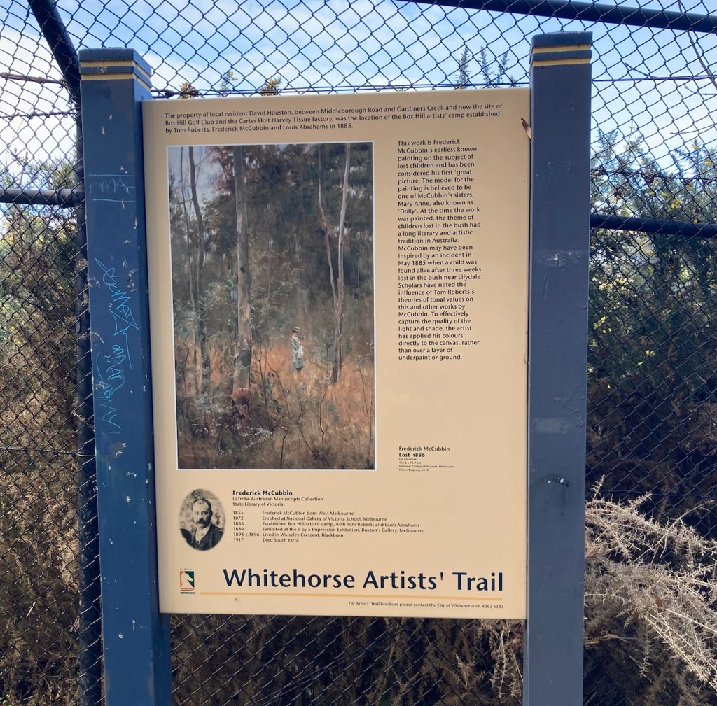 The section we were on today also went along the Box Hill Golf Course and provided an Art Walk of sorts, as it gave some information on the art camps and artists that used to work in the area. From the signs posted, we learned about 3 local artists, Tom Roberts, Frederick McCubbin, and Louis Abrahams, that established an art camp in 1885 on a local farm that is now occupied by the Box Hill Golf Course to encourage open-air painting as was popular in Europe at the time.
