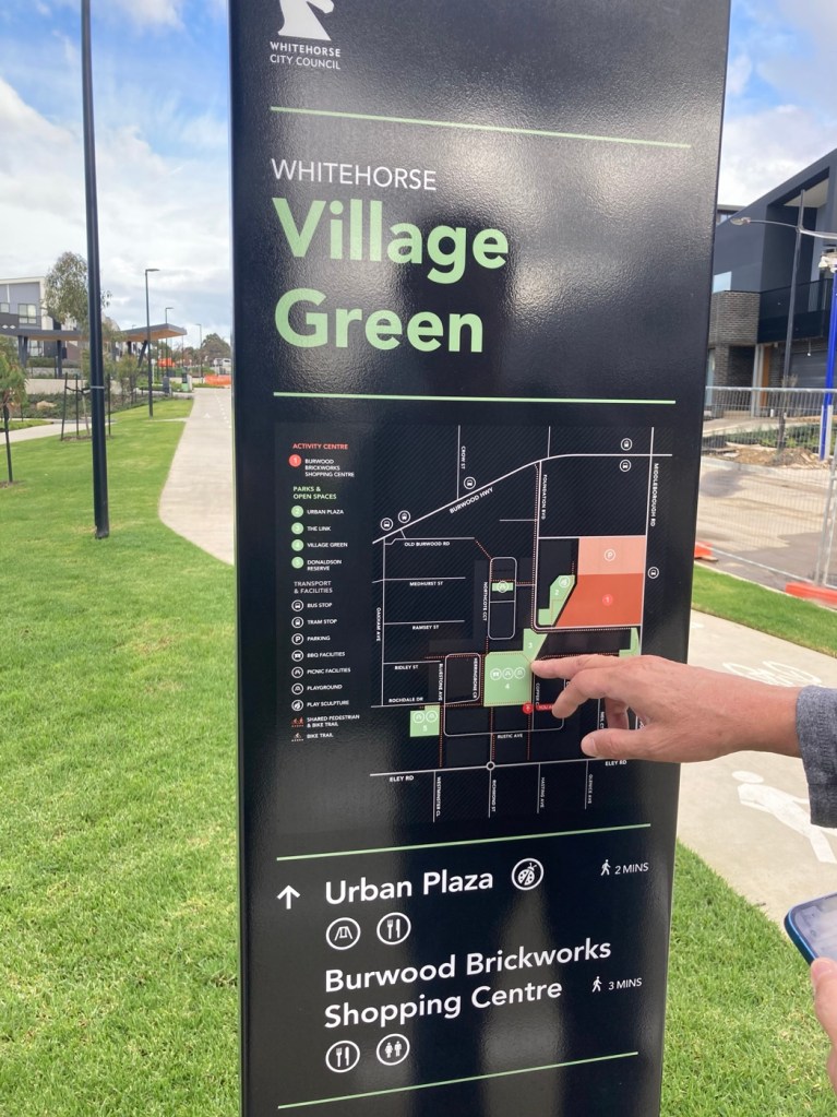 Entering the park to start the trail from Middleborough Road, a main thoroughfare near where we are staying The initial signage for the trailLooking across the wetlands areaAnother view of the wetlandsThe paved trail through the parkA bridge connecting another neighborhood to the trailA little creek along the trailOne of the playgrounds along the trailThe trail through Eley ParkThe impressive Village Green of a new subdivision near the shopping center where we were headedBob pointing out where we were located on the map. We were headed to the Burwood Brickworks Shopping Centre.The view of the shopping center from the subdivision. We would normally approach it from the other side (Middleborough Road).