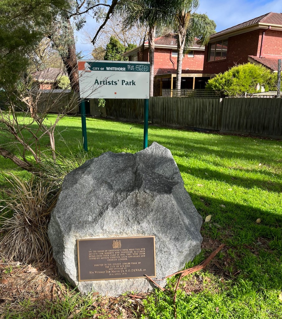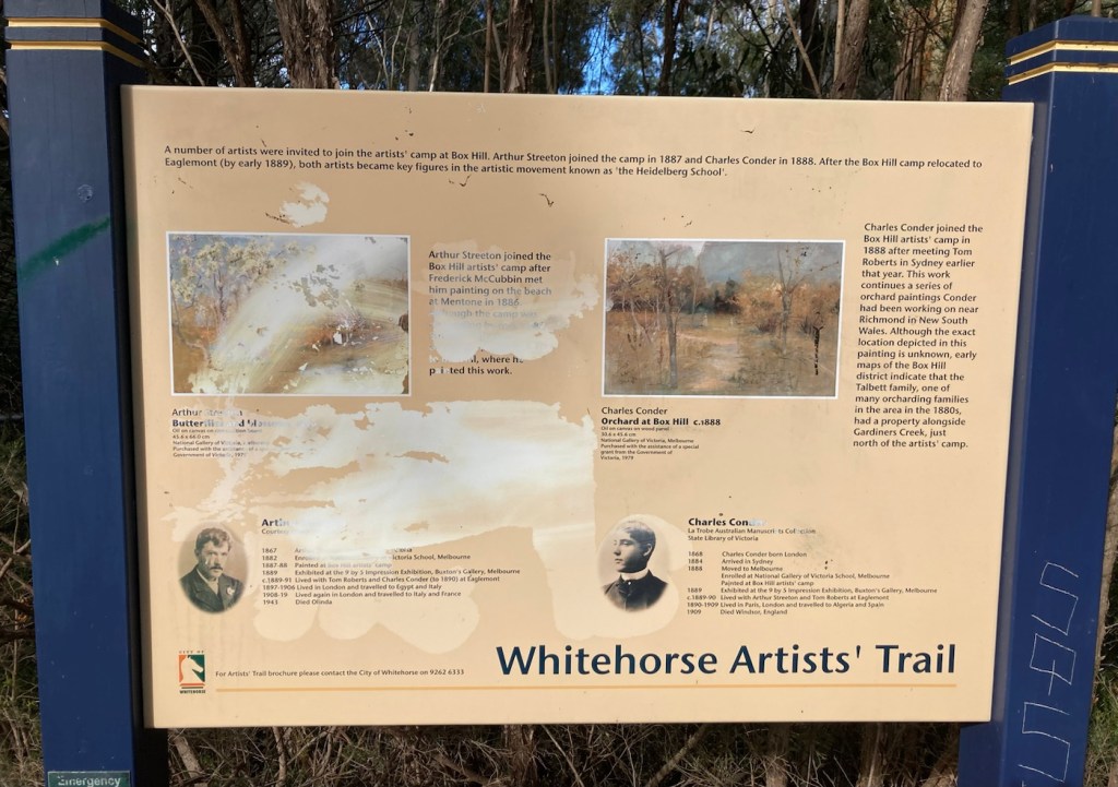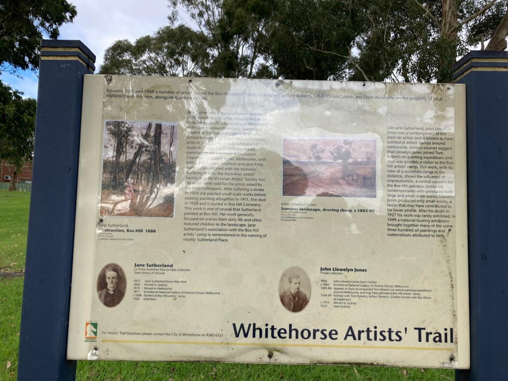 This is a poorly taken photo by me near our subdivision that provides information and sample paintings of two artists that painted at the camp — Jane Sutherland (born in New York) and John Llewelyn Jones (born in Carlton, Victoria)A photo of the very green Box Hill Golf CourseInformation and a sample paining near the golf course of one of the founders, Tom Roberts (born in England)Information and a sample painting of another founder of the art camp — Frederick McCubbin (born in West Melbourne)A bridge over the creekAnother shot of the golf course The tree-lined pathHad to work a little harder at this worn display to learn about 2 more artists — Arthur Streeton (born Mount Duneed, Victoria) and Charles Conder (born in London)Alerts along the shared path