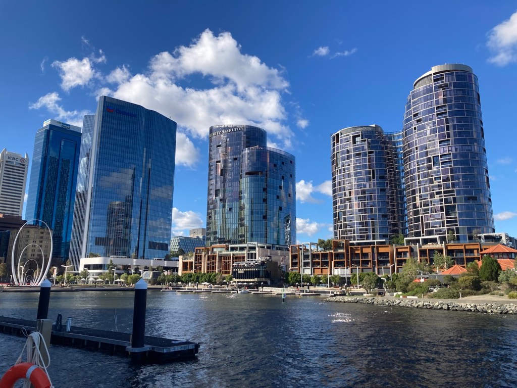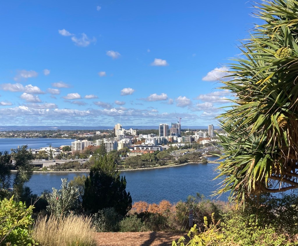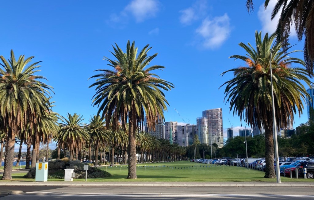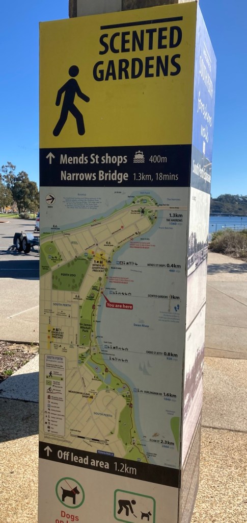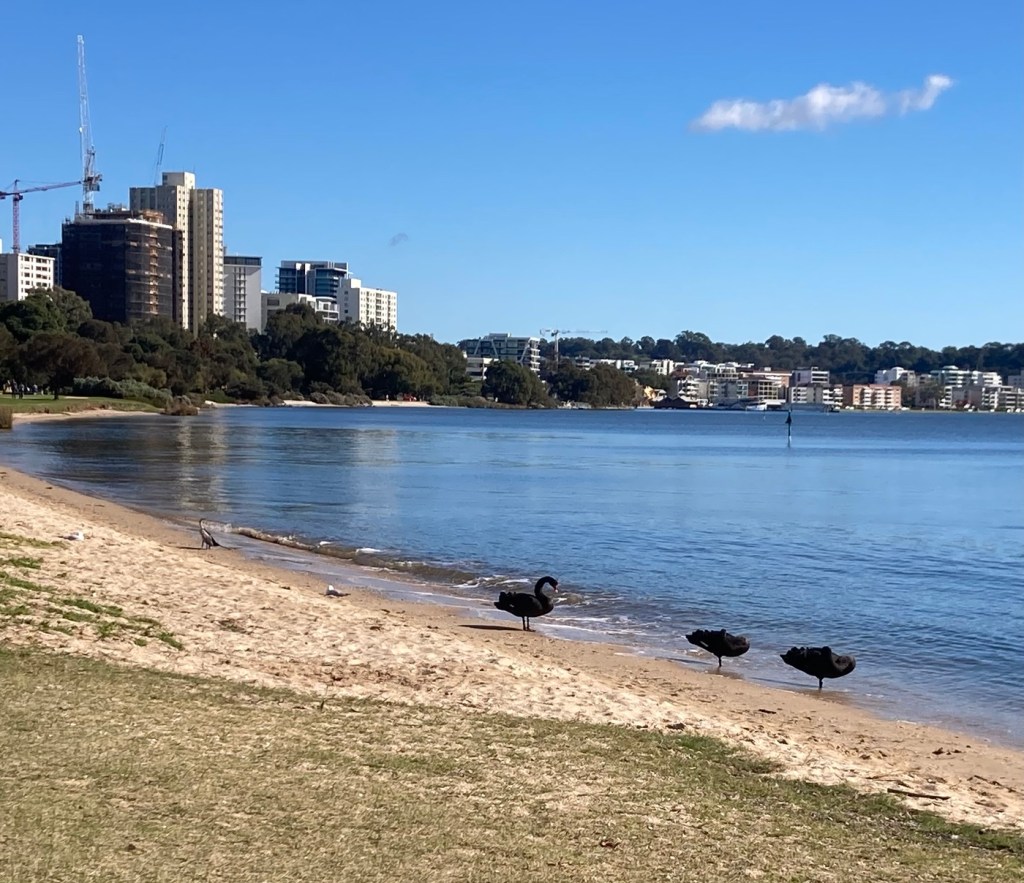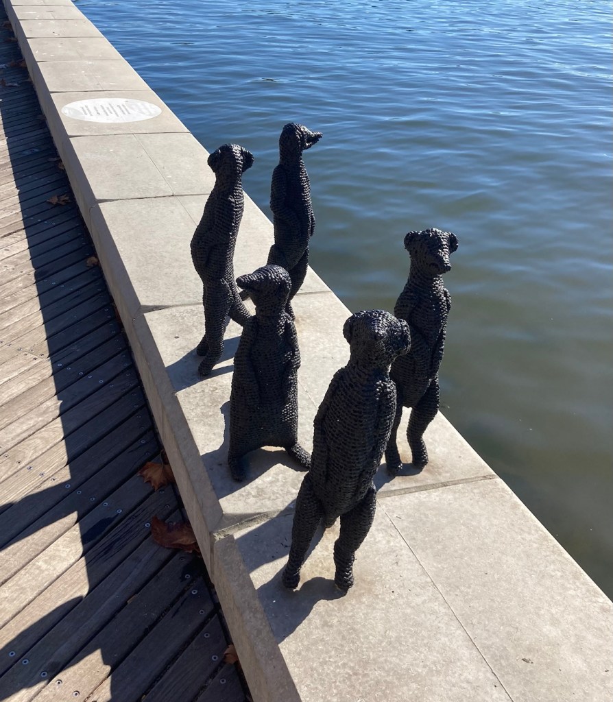 Walking past Langley Park, which runs about 1k along the Swan River and hosts a number of annual events Looking across from Perth city center towards South PerthOne of many restaurants along the Swan RiverOn Heirisson Island, looking back towards downtown PerthFound 2 shy kangaroos hiding in the woods, as we were heading off the island thinking that maybe the kangaroos had all been moved due to ongoing construction of a pedestrian bridge over the causeway.On the south side of the Swan River looking back at downtown through some beautiful palm treesThree of many black swans that we spotted Some helpful signage along the trailR/evolve sculpture by Ben Jones, Angela McHarrie, and Tony Jones, 2021. It is located in Sir James Mitchell Park (another lovely large park along the Swan River) near the Mends Street shopping areaSome fun meerkat sculptures also located in the Mends Street shopping areaA sculpture and fountains in Kings Park. Kings Park is an almost 400 hectare park on Mount Eliza overlooking the Swan River, South Perth, and the CBD.Looking at South Perth from Kings ParkA unusual (for us) bush/tree in the botanic gardens in Kings ParkThe impressive war memorial atop Mount Eliza in Kings ParkAn attractive pedestrian bridge in Elizabeth Quay in downtown PerthMore beautiful buildings and sculptures along Elizabeth Quay
