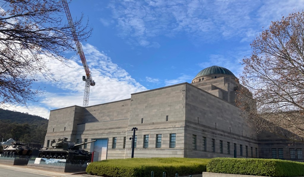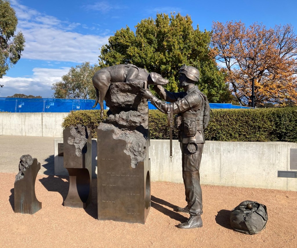 A view of the War Memorial from the side not enclosed in construction fencingBomber Command by Neil Dawson in honor of the Australian Air ForceSandakan Memorial by Anne Ferguson commemorating the 1,787 Australian prisoners of war who died in the Sandakan death marches in Borneo at the end of World War II.A memorial to working dogs in war, first used by Australian forces in 1918.