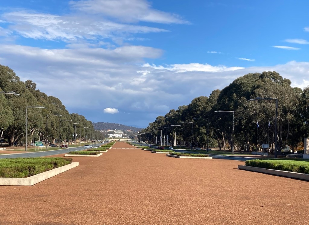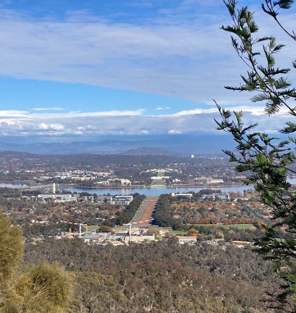 The path up, through the white barked trees that we have seen throughout our trip. Maybe eucalyptus or gum trees?View of the ANZAC Parade (wide street) that lines up with Parliament House across the riverView of the city center