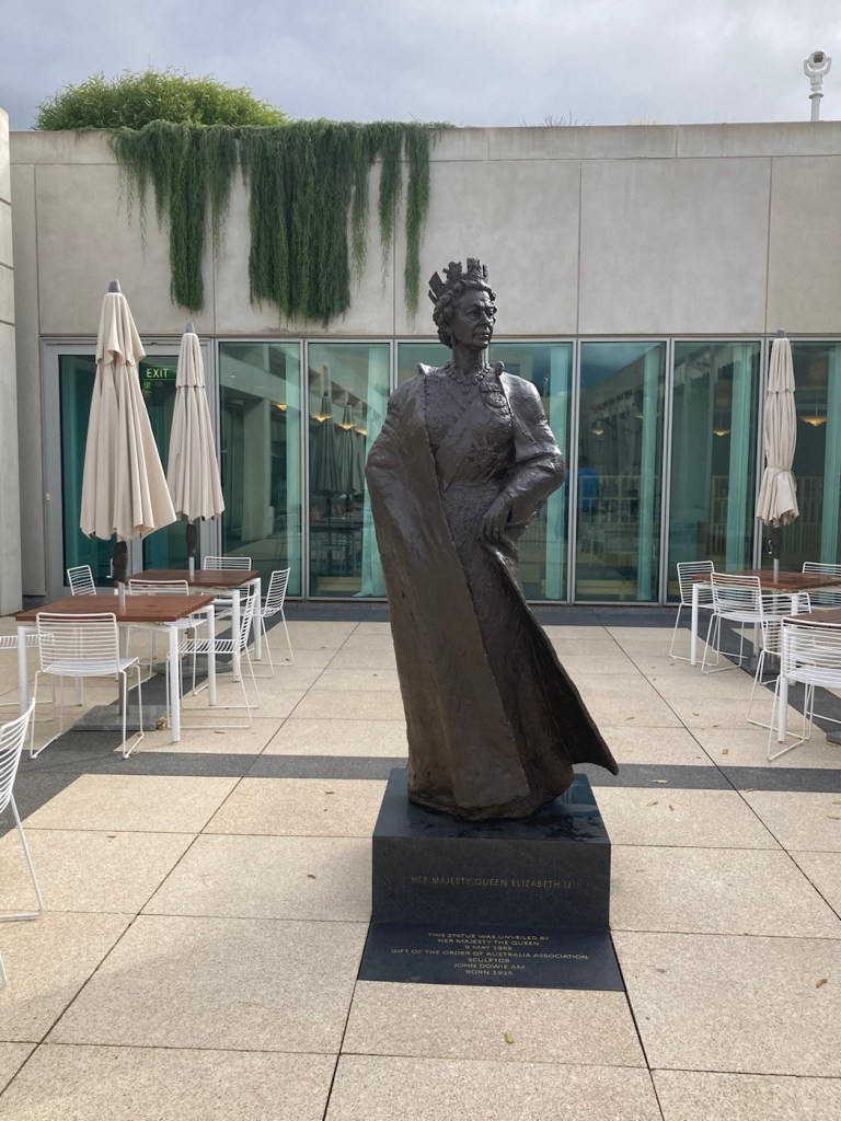 The very unique looking new Parliament Building built into a hill.The lobby of the very understated capitol.The chamber for the House of Representatives The Senate chamberView of the Queen’s Terrace, front lawn, ANZAC Parade, the War Memorial, and Mount Ainslie from on top of the roof of the Parliament Building.A statue of Queen Elizabeth II that she unveiled at the opening of the building.