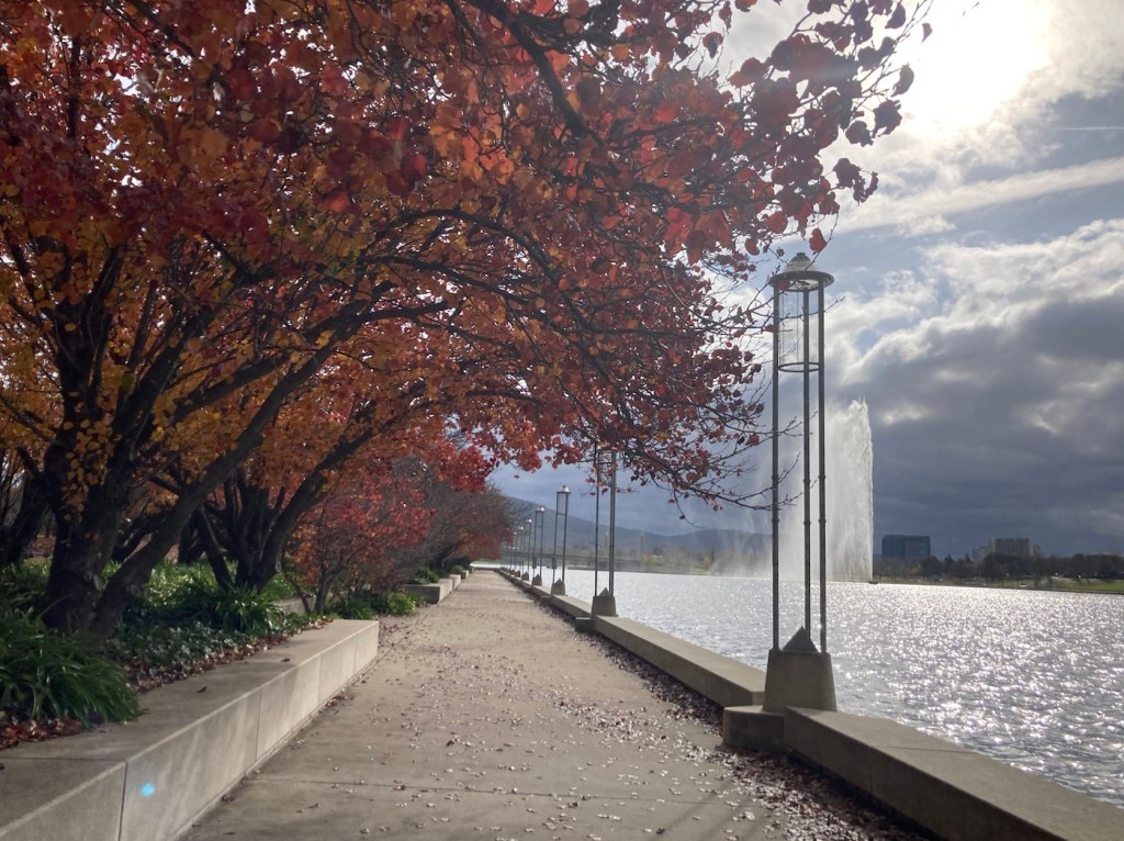 A rivers edge cafe and some of the many national flags displayed throughout the Parliamentary ZoneThe waterside trail with the beautiful fall-colored leaves and the Captain Cook Water Jet in the background The commemorative stand for the 2012 Australians of the Year recipients. The awards were first given in 1961, and the walk was opened in 2006.