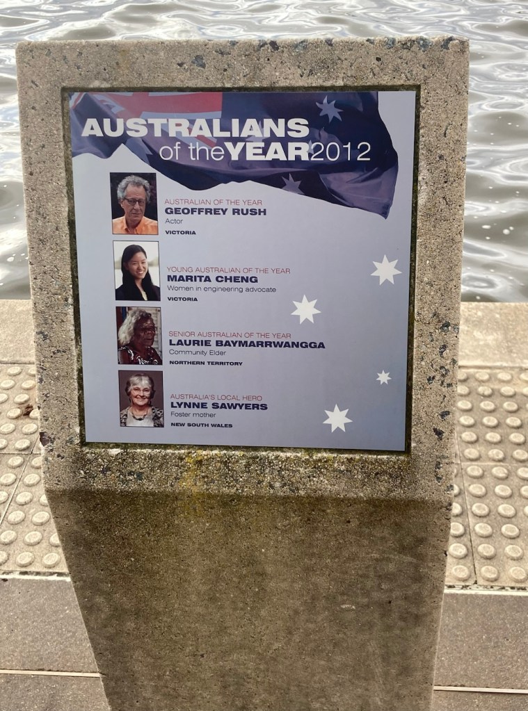Heading back into town, we walked along the waterfront where there are a number of flags displayed as well as an Australian of the Year Walk that honors Australians in different categories.