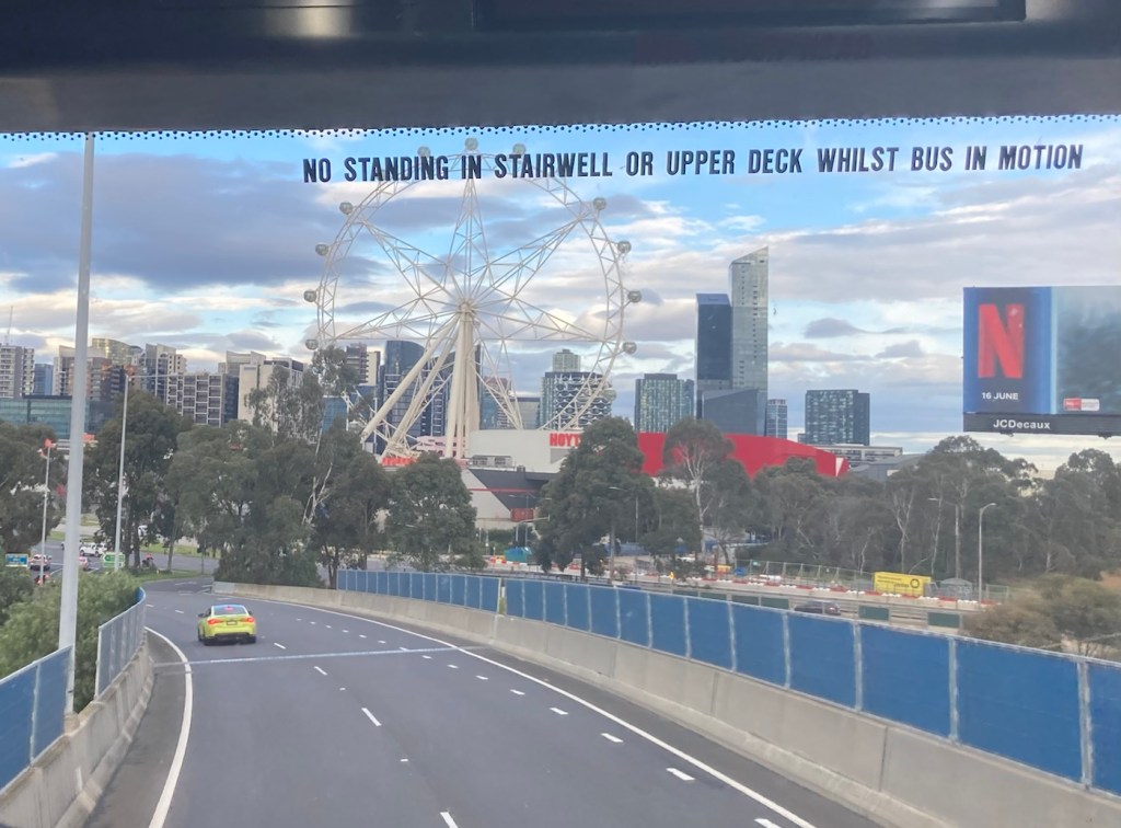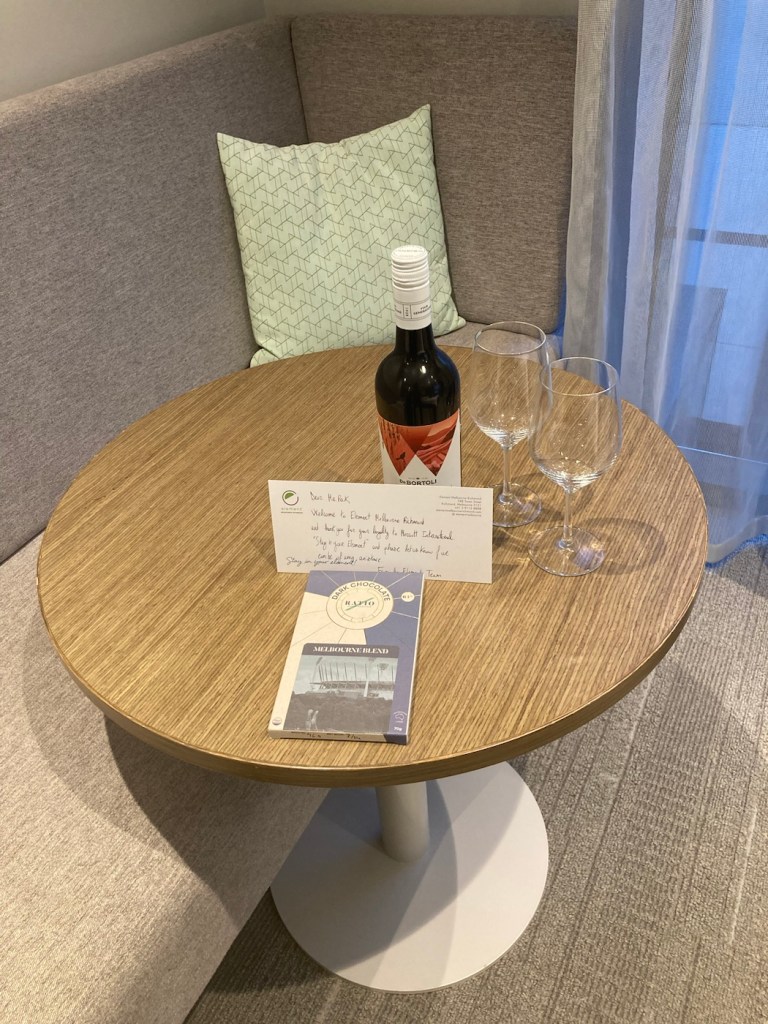 Airplane watching’ in the Virgin Australia lounge in the Canberra airport View from the top level of the Sky Bus headed into the Southern Cross bus/train station in downtown Melbourne.Melbourne’s version of the eye and the city skylineMore of the skyline from the busOne of the many trams that travel throughout Melbourne View out of the #70 tram route that we took out of the city center towards Wattle ParkA lovely end to Bob’s early 60th birthday celebration, which has been filled with airplane and hotel upgrades. Being a Marriott club member has given us a lot of free perks, including this surprise.